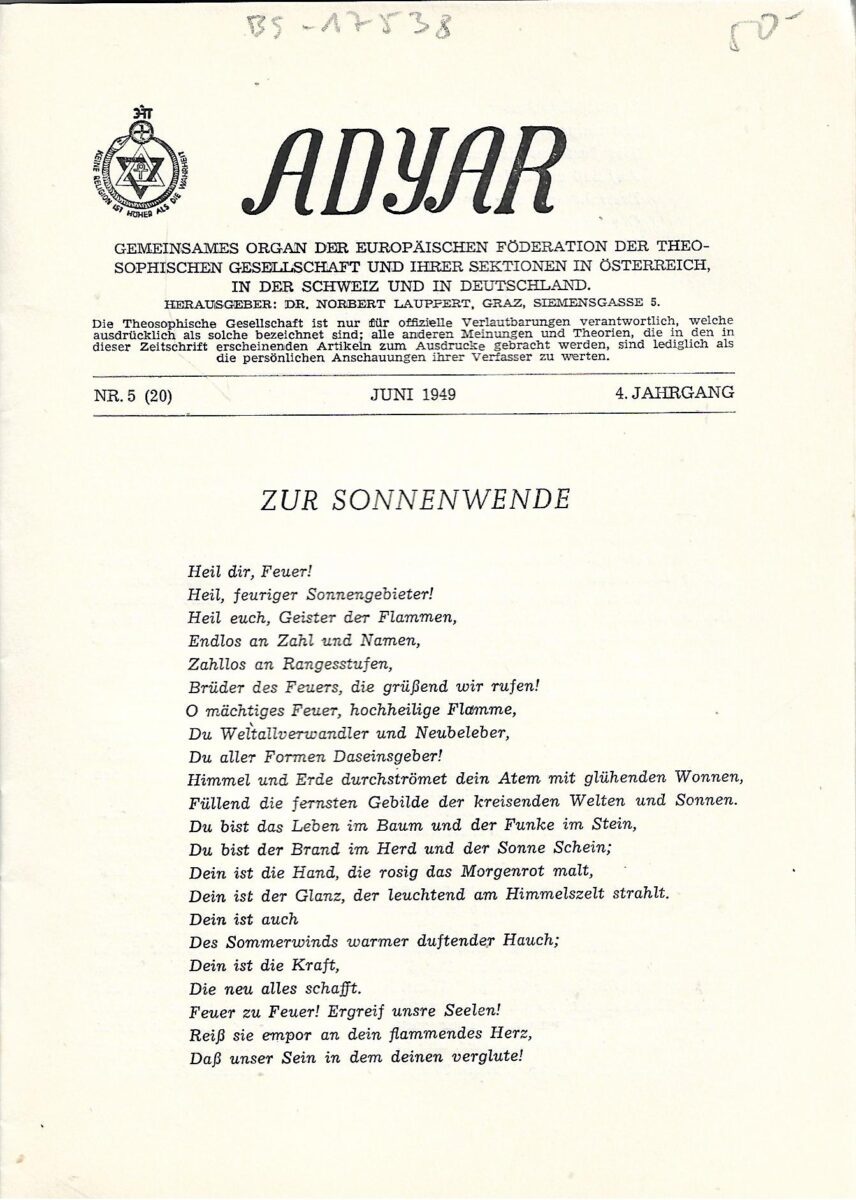 Izdavač i godina: Austrijsko teozofsko društvo Adyar, Adyar-Verlag, 1949.