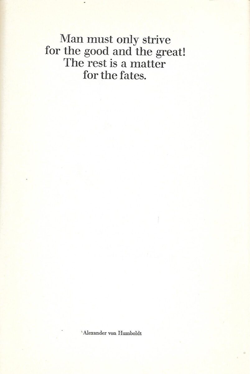 Alexander von Humboldt (1769 – 1859) was a Prussian geographer, naturalist, explorer, and influential proponent of romantic philosophy. His quantitative work on botanical geography laid the foundation for the field of biogeography and his advocacy of long-term systematic geophysical measurement laid the foundation for modern geomagnetic and meteorological monitoring. Contemporaries spoke of him as second in fame only to Napoleon. All over the Americas and the English-speaking world, municipalities are still named after him, along with mountain ranges, bays, waterfalls, three hundred plants, and more than one hundred animals. There is a Humboldt Glacier, a Humboldt Asteroid, a Humboldt Hog-nosed Skunk. Off the coast of Peru and Chile, the giant Humboldt Squid swims in the Humboldt Current and even on the moon there is an area called Mare Humboldtianum. Darwin called him the “greatest scientific traveler who ever lived.” Humboldt’s popular writings inspired many scientists and naturalists, including Charles Darwin, Henry David Thoreau, John Muir, George Perkins Marsh, Ernst Haeckel, as well as brothers Richard Schomburgk and Robert Schomburgk. . . . . Contents: Alexander von Humboldt / Adolf Meyer-Abich.– Alexander von Humboldt’s synthesis of literature and science / Cedric Hentschel.– Letters from his travels / Alexander von Humboldt. — Chronological table. — The Alexander von Humboldt Foundation. . . . . Adolf Meyer-Abich (1893 – 1971) was a German philosopher, historian of science, university librarian, and university professor in Germany and Chile. He was one of the founders and main representatives of holism.