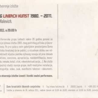 Kartolina – Russtellung Laibach Kunst 1980.-2011. Dom hrvatskih likovnih umjetnika06.05.-26.05.2011. Izdavač: HDLU, Zagreb Godina izdanja: 2011. Format: 14×9,5 cm