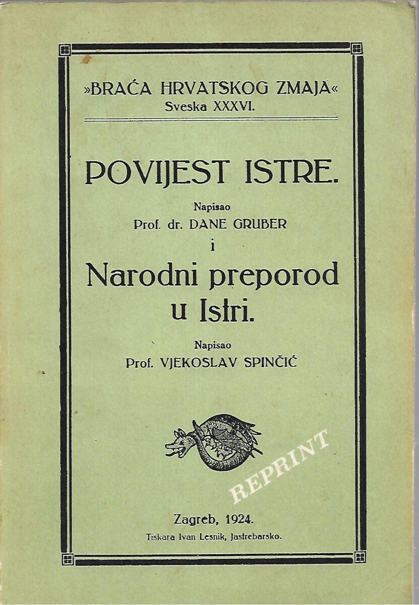 Ovaj reprint dolazi u izdanju Družbe Braće Hrvatskoga Zmaja iz 1924. godine i obrađuje povijest Istre od kamenog doba, preko razdoblja rimske vlasti do devetnaestog stoljeća, a u drugom dijelu knjige prof. Vjekoslav Spinčić obrađuje Narodni preporod u Istri.