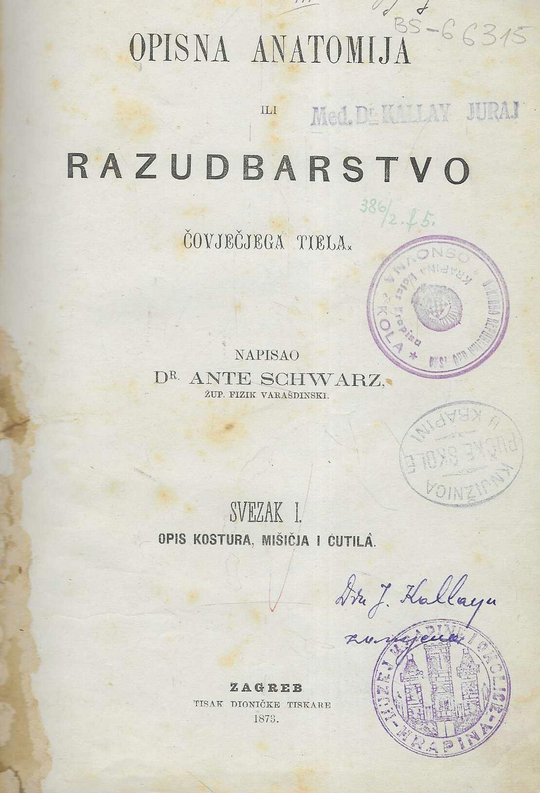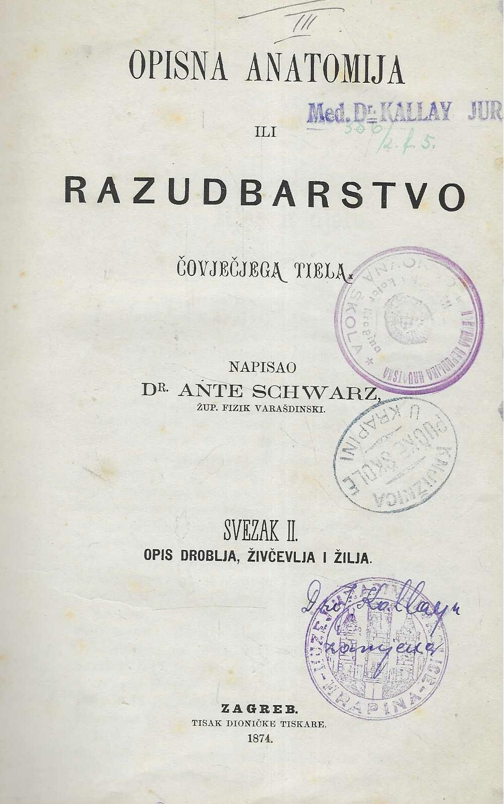 Opisno razudbarstvo ili anatomiju čovječjega tiela, koju evo obćinstvu u dva svezka predajem, pisao sam našim jezikom glavno radi strukovnoga nazivlja, koje se kod nas tek razvija, pa je ne samo liečniku u obće, a zdravstvenu činovniku na pose od potriebe, već i svakomu naobraženu čovjeku, koga zvanje napučuje na domaći naš jezik.