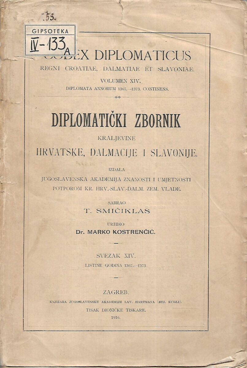 Diplomatički zbornik Kraljevine Hrvatske, Dalmacije i Slavonije (Codex diplomaticus Regni Croatiae, Dalmatiae et Slavoniae), kritičko izdanje latinskih javnih i privatnopravnih izvora koji se odnose na hrvatsku povijest od ranoga srednjeg vijeka do 1399. Zbirka se sastoji od 18 svezaka i sadrži prijepise najvažnijih papinskih, vladarskih i isprava drugih duhovnih i svjetovnih uglednika, a njezino je izdavanje 1904. započeo T. Smičiklas, potaknut znanstvenim, ali i političkim pobudama, kada je, zbog madžarskog pritiska, bilo nužno upozoriti na temelje hrvatske državne samostalnosti u ranom srednjem vijeku i neprekinutoga kontinuiteta Trojedne Kraljevine kroz cijeli srednji vijek. Znanstveno i metodološki T. Smičiklas se u priređivanju toga kritičkog izdanja oslanjao na znamenito izdanje Monumenta Germanie historica. Sam je kritički uredio prvih 11 svezaka, a nakon njegove smrti (1914) gradivo koje je prikupio uredili su E. Laszowsky (svezak 13), M. Kostrenčić (svesci 13–16), S. Gunjača (svezak 17) i D. Rendić-Miočević (svezak 18). Smičiklas je prvo 1904. za tisak priredio 2. svezak Diplomatičkoga zbornika (razdoblje 1101–1200), dok je 1. svezak (razdoblje 743–1100) tiskan tek 1967., a priredili su ga M. Kostrenčić, J. Stipišić i M. Šamšalović. Karakteristično je za cijelo izdanje da se prema kraju srednjeg vijeka raspon razdoblja koja je svaki pojedini svezak obuhvaćao sve više smanjivao, što je posljedica sve većega broja sačuvanih diplomatičkih i privatnih isprava, pa je posljednji, 18. svezak, obuhvatio razdoblje 1395–99. Uz spomenute su znanstvenike na Diplomatičkom zborniku radili istaknuti hrvatski diplomatičari: M. Šufflay, E. Fermendžin, F. Šišić, B. Krnic, J. Lučić, Mirjana Matijević Sokol, Vesna Gamulin Tudjina i dr. Budući da je kasnijim istraživanjima u raznim arhivskim ustanovama u zemlji i inozemstvu pronađen niz novih diplomatičkih izvora, 1991. započelo je izdavanje Dodataka Diplomatičkog zbornika (Supplementa Codicis diplomatici), a dosad su tiskana dva sveska, od kojih su prvi (1998) priredili H. Sirotković i J. Kolanović, a drugi (2002) J. Barbarić i Jasna Marković.