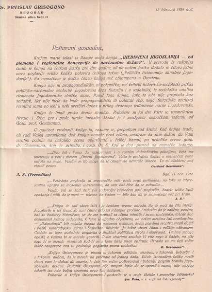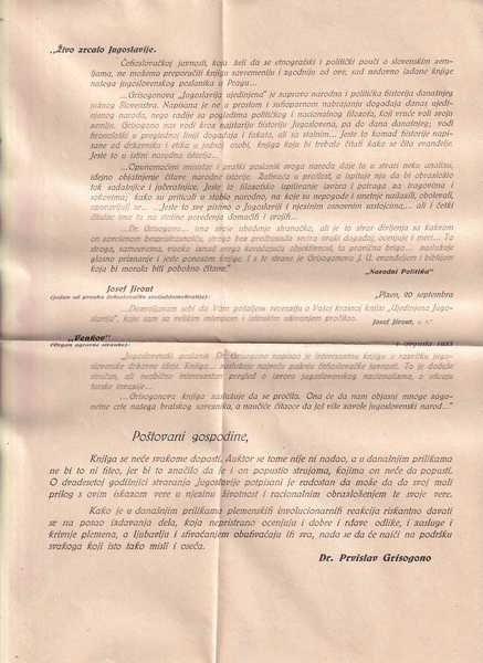 + 2 karte (Razmeštaj Hrvata i Srba pre turske invazije i Jugoslavija po veroispovesti). GRISOGONO, Prvislav, političar jugoslavenske orijentacije (Split 1879 — Pariz 1969). Za II. svjetskog rata živi povučeno u Beogradu, skuplja obavijesti o prilikama u zemlji i dostavlja ih kraljevskoj vladi u izbjeglištvu. Zanimljiva je epizoda uz njegov boravak u zatvoru potkraj 1941. i na poč. 1942, kamo je dospio kao pripadnik slobodnozidarske lože i anglofil