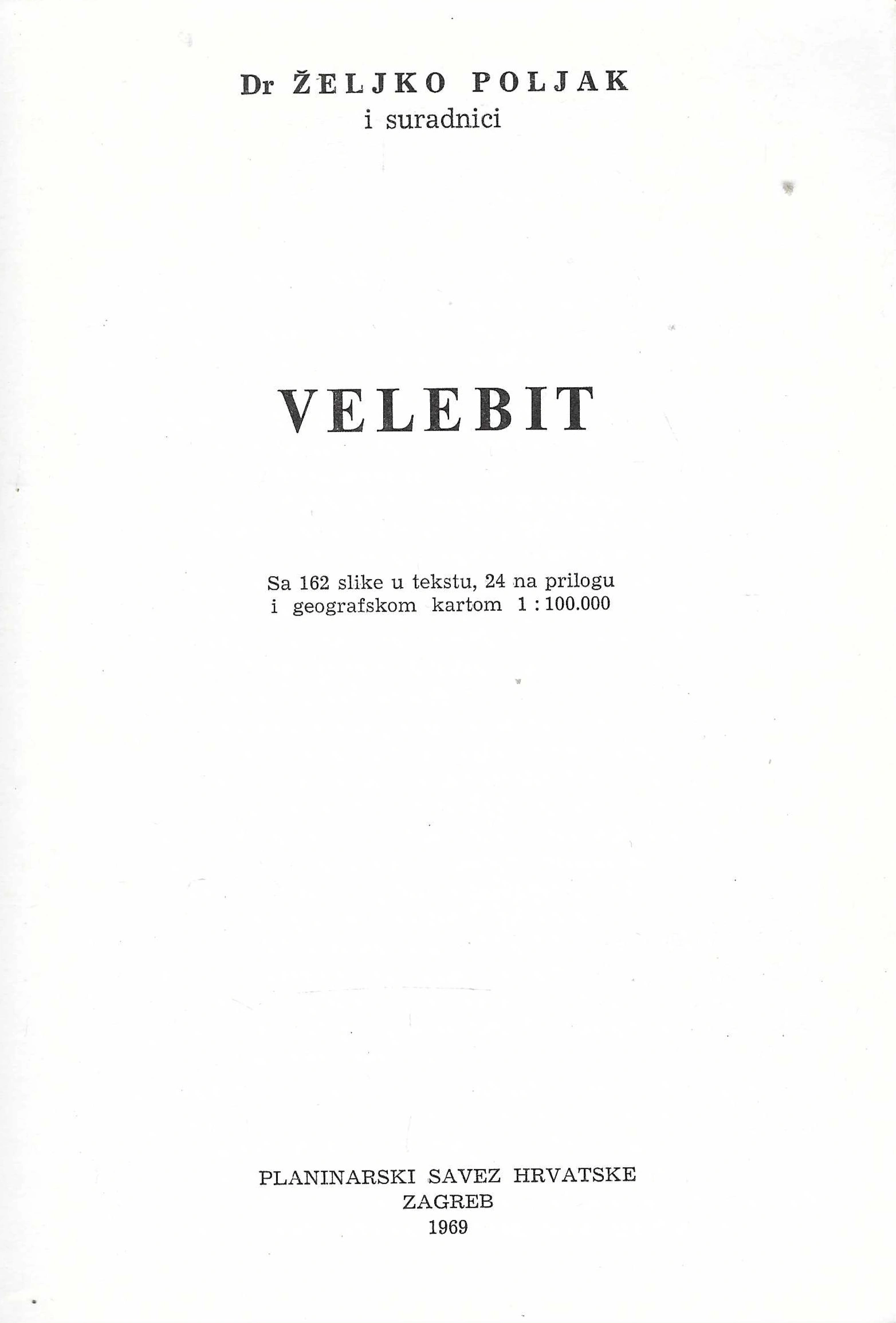 Dr. Željko Poljak i suradnici: Velebit, sa 162 slike u tekstu, 24 na prilou i geografskom kartom 1:100000
