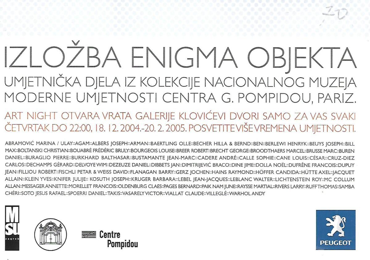 Enigma objekta, izbor iz velike zbirke Nacionalnoga muzeja moderne umjetnosti Centra Georges Pompidou iz Pariza, jednog od najvećih svjetskih muzeja moderne i suvremene umjetnosti. Enigma objekta nastala je suradnjom pariškoga Centra Pompidou i zagrebačkog Muzeja suvremene umjetnosti, koji slavi pola stoljeća postojanja i očekuje dovršenje nove zgrade, čiji se obrisi naziru u novozagrebačkom naselju Središće. Inicijator i autor projekta Želimir Koščević, muzejski savjetnik MSU-a, još je prije četiri godine izašao sa zamisli o realizaciji tako velika projekta – najvećega projekta Muzeja suvremene umjetnosti ikada. Za prvih susreta i razgovora u Parizu, Francuze je najviše zanimalo što bi se to, iz goleme zbirke od gotovo 55 000 umjetničkih djela, moglo predstaviti Zagrebu.