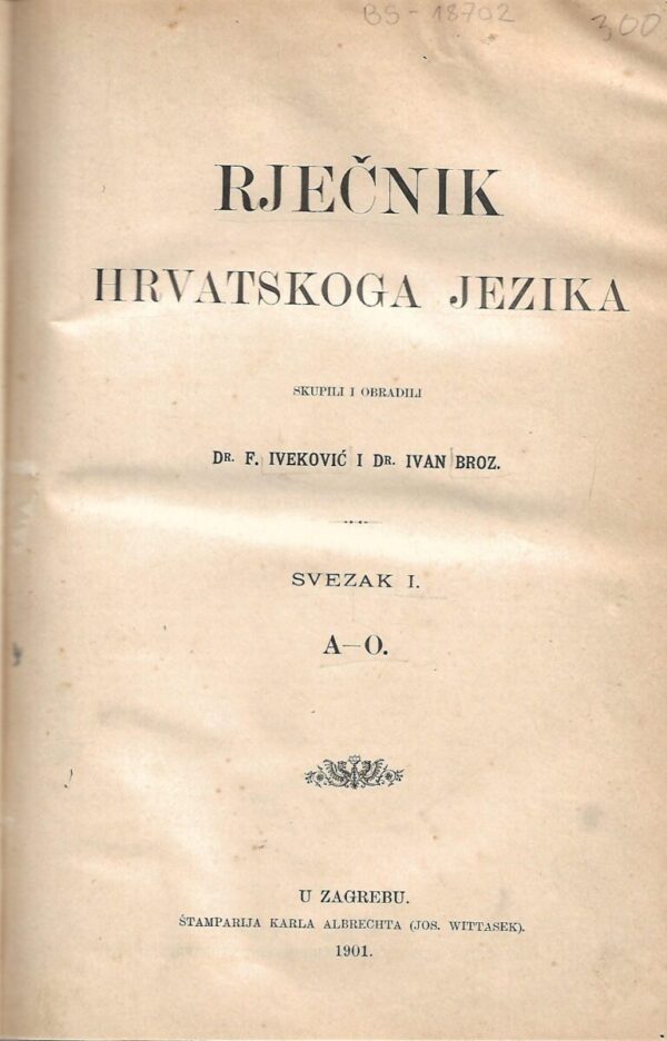 F. Iveković i Ivan Broz (skupili i obradili): Rječnik hrvatskoga jezika, svezak I. A-O