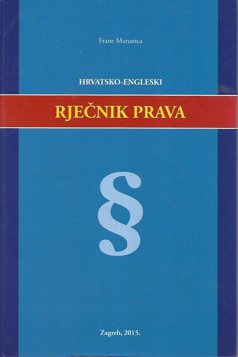 Iskoristite priliku i nabavite sniženi Maruničin HRVATSKO-ENGLESKI RJEČNIK PRAVA. Ovaj pravni rječnik sa 1237 stranica obogatit će vašu kućnu knjižnicu. Autr Marunica napisao je prvi pravni hrvatsko-engleski rječnik u Hrvatskoj koji tematski pokriva sva pravna područja. Ovo kapitalno djelo može pomoći studentima prava, odjvetnicima, sucima, sudskim tumačima, novinarima, političarima i svima koji se bave problemima pravne komunikacije.