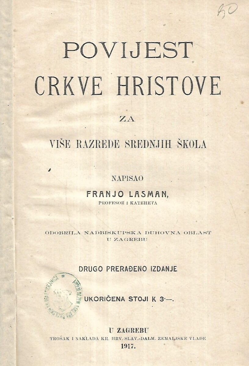 Franjo Lasman: Povijest Crkve Hristove za više razrede srednjih škola