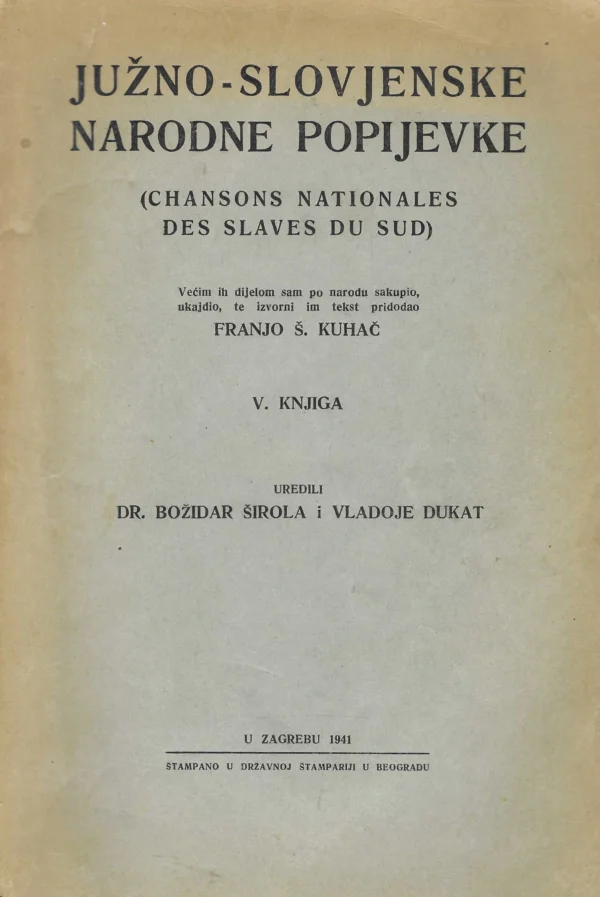 Zbirka narodnih pjesama koje je skupio i zapisao u notni zapis Franjo Kuhač. Knjiga dolazi u izdanju zagrebačkog JAZU-a iz 1941. godine.