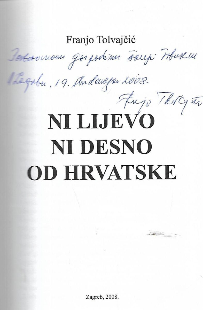 Knjiga je, naime, u privatnoj nakladi objavljena još 2008., no ova zakašnjela promocija ne oduzima joj, naravno, ništa od vrijednosti i aktualnosti jer sve što je Franjo Tolvajčić uočio, interpretirao i zabilježio, dobilo je u međuvremenu nove dimenzije i nove potvrde da se radi o spletu opasnih koraka i pojava na štetu Republike Hrvatske.