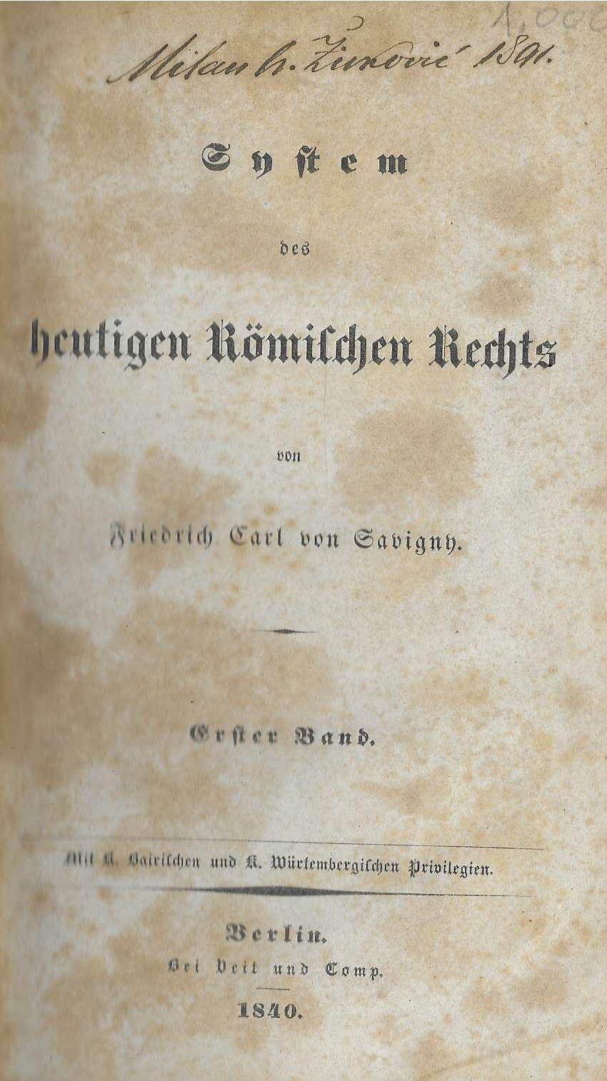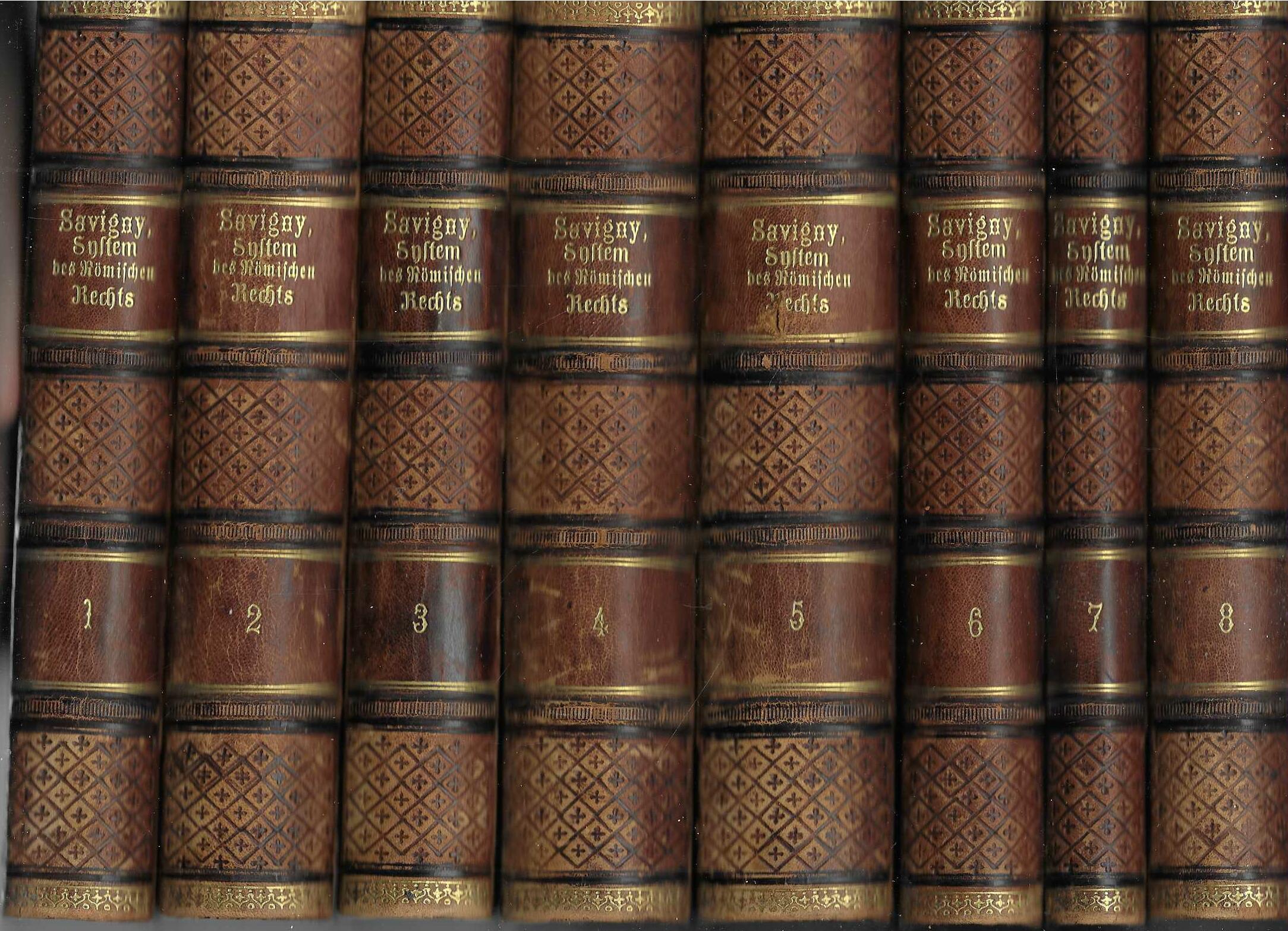 Berlin, Veit & Comp, 1840-49. 8vo. L,+ 429,+ (1); VI,+ 559; VI,+ 473; VI,+ 616; VI,+ 646,+ (1); XI,+ (blank),+ 535; XV,+ (blank),+ 309,+ (1); XIV,+ (2, blanks),+ 540 pp. Foxing in part one. Together with:HEUSER, O. L. Sachen- und Quellen-Register zu von Savigny?s System des heutigen römischen Rechts. Berlin, Veit und Comp, 1851. 8vo. (3),+ (blank),+ 383,+ (1) pp. Uniforme contemporary (probably Swedish) half calf, blind stamped and gilt spines and marbled board papers. Nine volumes, repair to hinges on volume two and three, volume four with minor cracks in the hinges. From the library of Nils. S. von Koch at Augerum. Fine copy of the first edition of Savigny?s monumental ?System des heutigen Römischen Rechts?, which is a work about the contemporary Roman law in Germany, and one of his most important. It is here complete with the sometimes missing Index volume published by O. L. Heuser in 1851. The German jurist Friedrich Carl von Savigny (1779-1861) is the most important member of the influential ?Historic School of Jurists?, which influenced by romanticism reacted against the natural law theories of the Enlightenment and claimed that national laws must be based on specific national cultural backgrounds and civilisations, an organic development of the Volkgeist. In this work which deals with the history of the sources, the literature and the teaching of Roman law from the fifth through the fifteenth centuries Savigny transcended Roman law in many respects, adapting it to modern requirements or developing new solutions, many of which have become influential in German and other legal science. And also ? it initiated the modern study of medieval jurisprudence and has served ever since, corrected in many respects but unequaled, as the standard work on the history of medieval jurisprudence in Europe? (Walter Wilhelm) His influence was large also in Sweden and in the Nordic countries. See Lars Björne ?Brytningstiden? (1998) pp. 229ff.Nils S. von Koch (1801-81) was an influential Swedish liberal jurist and politician, married to Francis Eliza Lewin from England. He was very engaged in the social questions of his time like education, penalty laws and prisons, voting rights etc. Thanks to his wife he also had a broad English network. Seller Inventory # 112487
