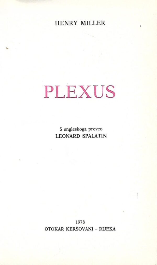 Trilogija Ružičasto raspeće (Sexus, Nexus, Plexus) je nabrijana, krvava, strastvena i u tom raz­redu prvoklasno djelo! Millerov rječnik je na trenutke brutalan, izravan do boli i jasan do srži. Ono što trajno privlači u svijet Henryja Millera upravo je njegovo dječački nabrijano poimanje i seciranje svijeta oko sebe, pri čemu se ne libi ogoliti vlastitu osobnost. Gotovo cijeli Millerov opus čista je esencija književnosti prve polovice prošloga stoljeća.
