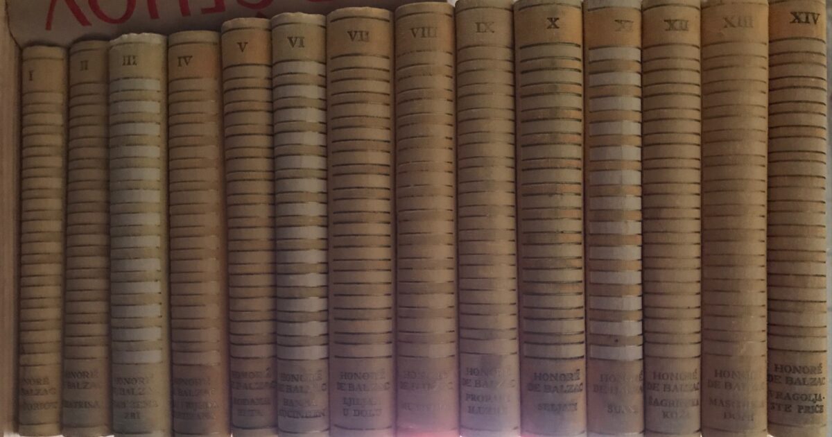 Knjiga 1 – Čiča Goriot, Pukovnik Chavert, Gobseck, Bezbožna Misa, Trgovina k mačku koji se lopta, Zabava u Sceauxu, Bračni ugovor Knjiga 2 – Beatrisa, Jedna Evina Kći, Napuštena Žena, Ženski likovi (I i II), Gospođa Firmiani, Zapisi dviju mlađih žena Knjiga 3 – Kad žena zri, Put u život, Modeste Mignon, Vendetta, Porodični mir, La Grenadiére, Albert Savarus Knjiga 4 – Sjaj i bijeda kurtizana, Tanja kneginje Kadignan, Zlatooka djevojka, Vojvotkinja de Langeais Knjiga 5 – Rođakinja Betta, Veličina i pad Cesara Birotteaua Knjiga 6 – Rođak Pons, Banka Nucingen, Glumili su i nehotice, Ferragus, Sarrasin, Jedan Poslovan čovjek, Pierre Grassou, Facino Cane, Jedan kralj bohema, Gaudissart II Knjiga 7 – Ljiljan u dolu, Muzej starina, Eugenija Grandet, Ursula Mirouet Knjiga 8 – Usidjelica, Pierretta, Departmanska muza, Mutivoda Knjiga 9 – Propale iluzije, Tourski pop, Slavni Gaudissart Knjiga 10 – Seljaci, Seoski liječnik, Seoski župnik Knjiga 11 – Slike iz vojničkog života, Slike iz političkog života Knjiga 12 – Slike iz filozofskog života, Knjiga 13 – Isus Krist u Flandriji, Prognanici, Major Cornelius, Crvena krčma, Mobilizirani vojnik, Drama na morskoj obali, Prokleto dijete, Massimilla Doni, Gambara, O Katarini Medici, Knjiga 14 – Vragoljaste priče, Sitni jadi bračnoga života
