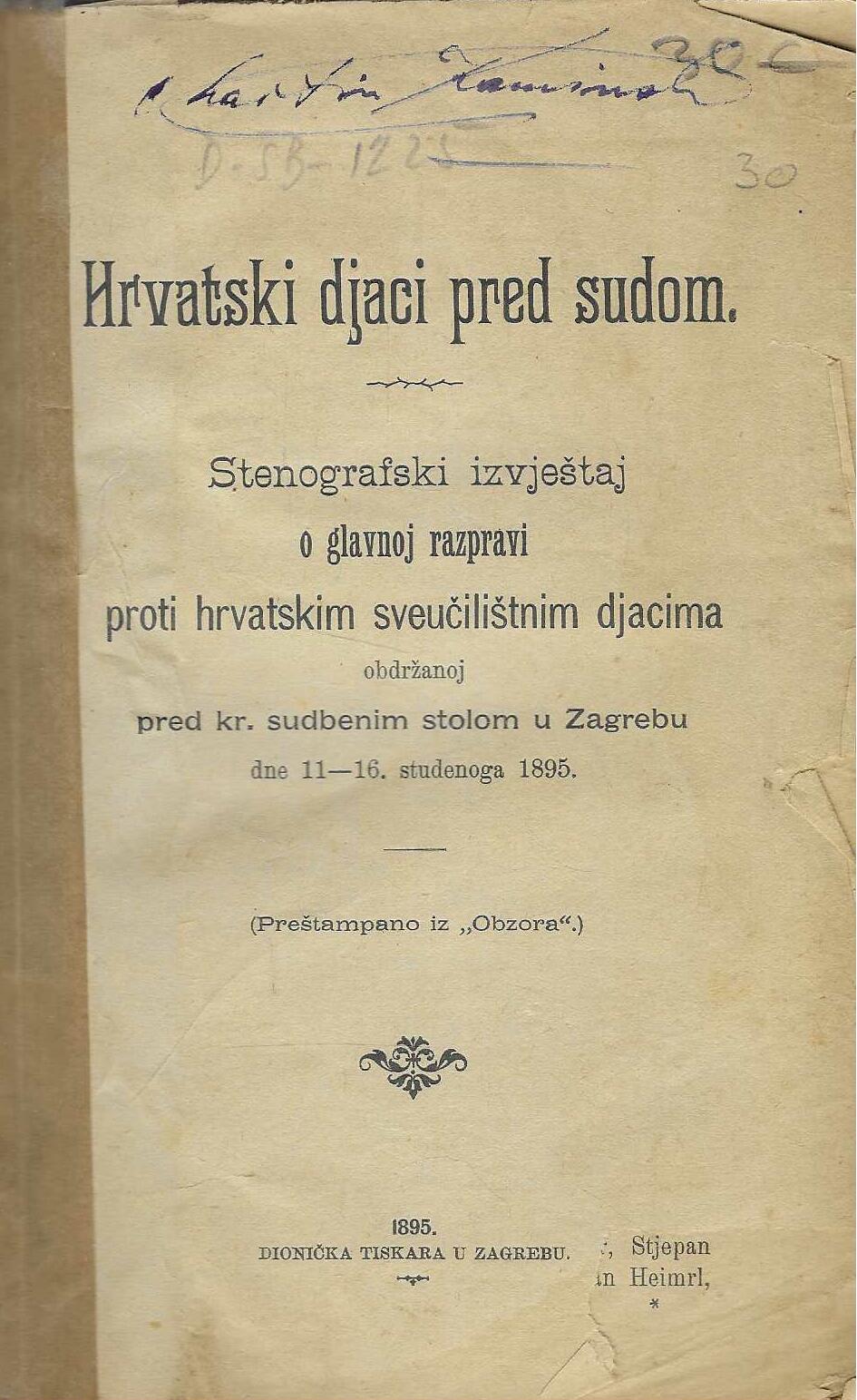 | Izdavač i godina: | Dionička tiskara, Zagreb, 1895. |