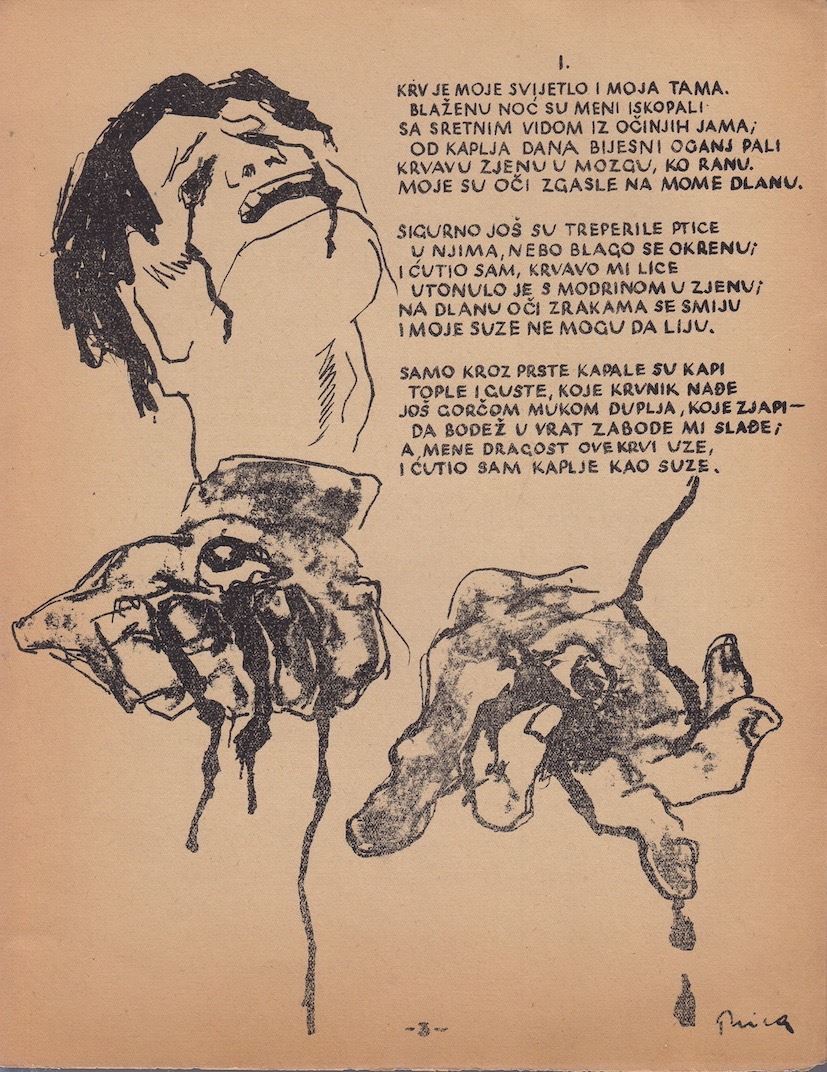 Ivan Goran Kovačić: Jama (The Pit). Poetic lithograph map. Lithographies by Edo Murtić and Zlatko Prica. Rare war edition, bound in parachute canvas. Printed in 250 copies, printed by a Partisan underground press during WWII, in 1944th, a year after the poet’s tragic death. Published in Topusko where in 1944. Congress held Croatian cultural workers in the liberated territory. Edo Murtić book sent to Theodore Roosevelt, Winston Churchill, Joseph Stalin and Pablo Picasso. Picasso made illustration for France edition of Jama (La fosse commune, 1948.)