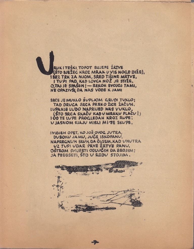 Ivan Goran Kovačić (21 March 1913 – 13 July 1943) was a prominent Yugoslav poet and writer of the 20th century. He was born in Lukovdol (part of Vrbovsko), a town in Gorski Kotar, to Croatian father Ivan and Jewish mother Ruža (née Klein). His middle name Goran stems from that (“goran” meaning “hill-man”). During World War II, he joined the Partisan forces. His best known work is “Jama” (The Pit), which ranks among the most celebrated Yugoslav poems ever written. He penned it during the war, while in service near the city of Livno, Bosnia and Herzegovina. The poem was written out of intellectual and ethical responsibility that condemns fascist atrocities committed by the Ustaše. Ivan Goran Kovačić was killed by Chetnik troops in an east-Bosnian village of Vrbica near Foča on July 13 1943. His work is an example of anti-war poetry with messages against torture, mass murders and war crimes.
