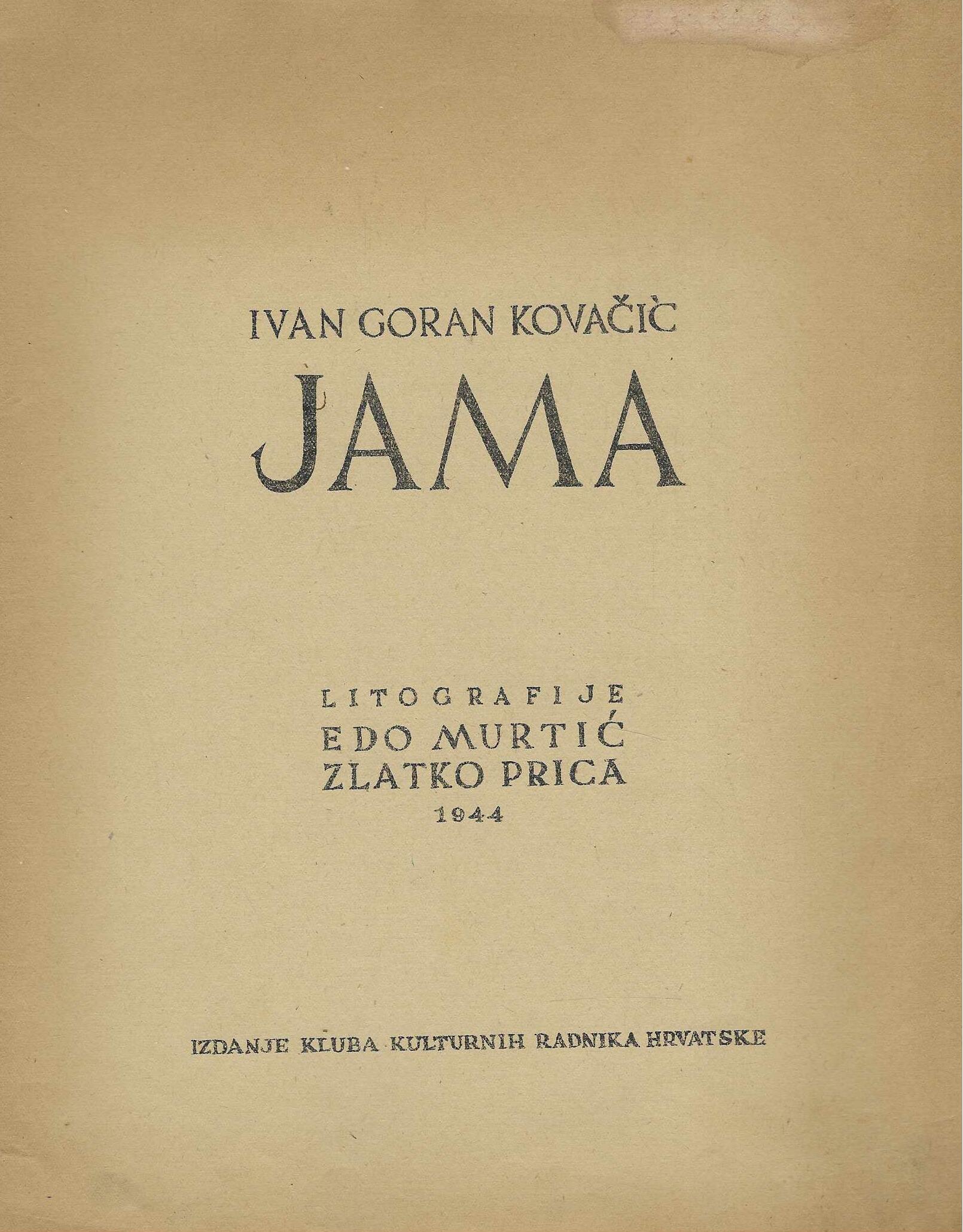 Ivan Goran Kovačić: Jama. Poetsko-grafička mapa. Litografija Ede Murtića i Zlatka Pice. Uvezano u padobransko platno. Tiskano u 250 primjeraka, ratne 1944., godinu dana nakon pjesnikove tragične smrti. Objavljena je u Topuskom, gdje je 1944. održan Kongres kulturnih radnika Hrvatske na oslobođenom teritoriju, a Edo Murtić mape je poslao Theodoru Rooseveltu, Winstonu Churchillu, Staljinu i Pablu Picassu.