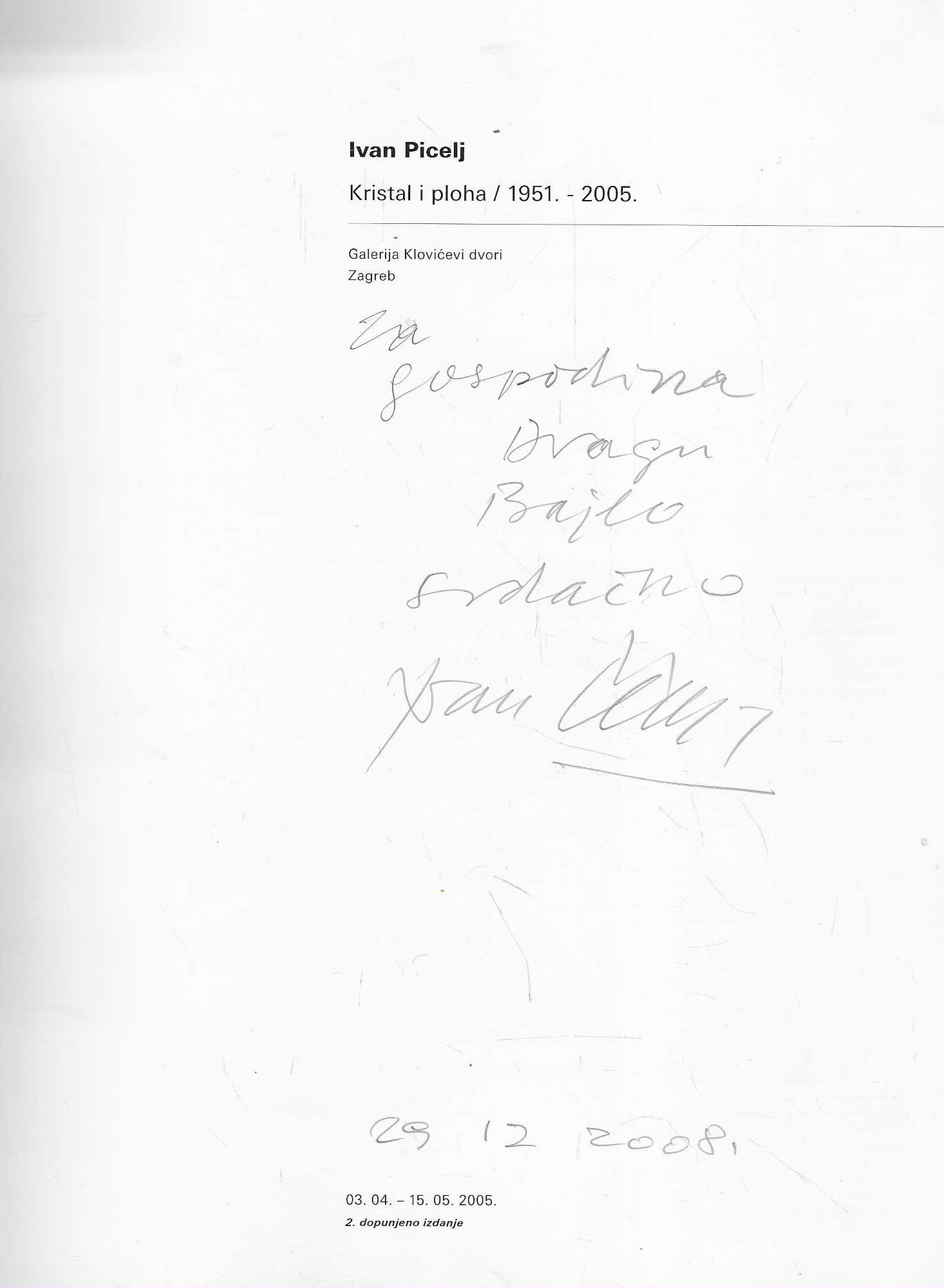 Katalog izložbe Ivan Picelj – Kristal i ploha 1951-2005. Bogato ilustrirana. Autori izložbe – Stane Bernik i Ješa Denegri. Postav izložbe Getulio Alviani. Dizajn pozivnice, plakata i depilanta izložbe Mihajlo Arsovski.