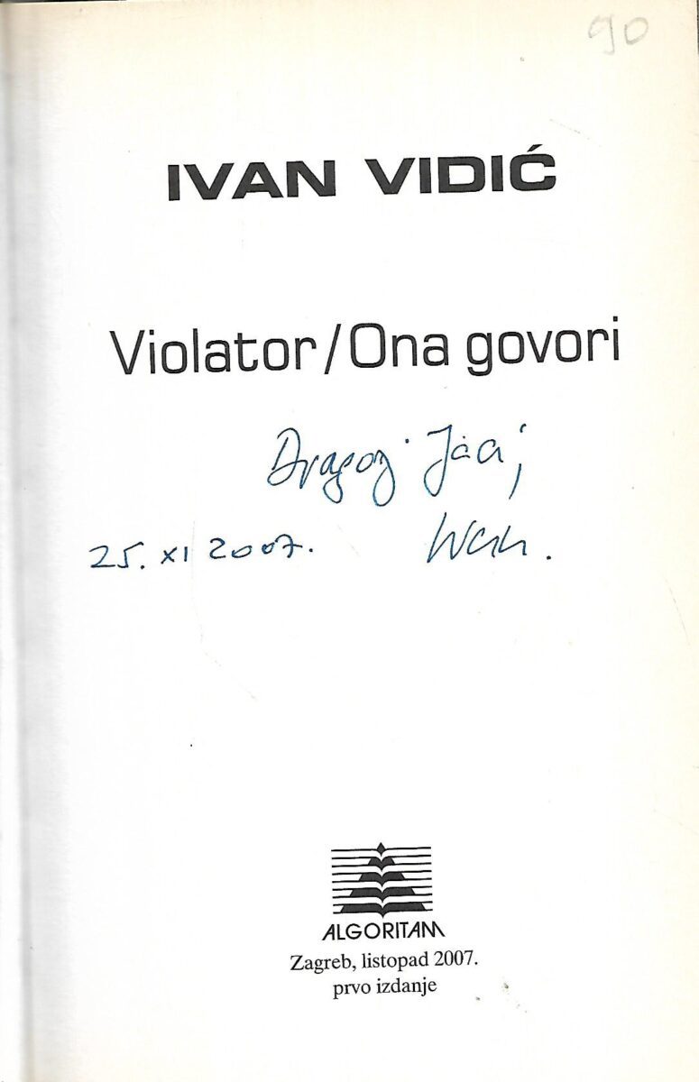 «Violator» i «Ona govori» su dva teksta Ivana Vidića iz prve polovice 1990-ih od kojih je «Ona govori» bio objavljen u časopisu Ka/Os, a Violator nigdje do sada. »Violator» je duža novela ili kraći roman – teško je i nepoželjno o tom ludom tekstu pametovati jer je, baš kao i lirska proza «Ona govori» – teško odredljiva žanra, roda i granica.