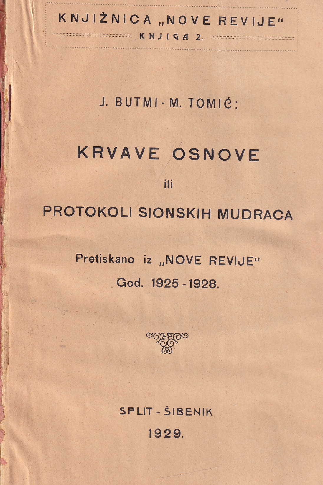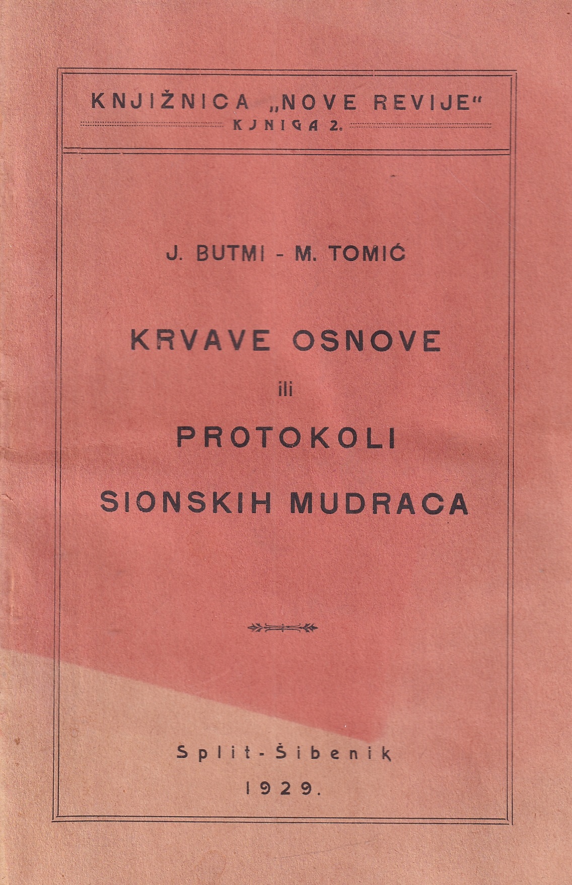 Zbirka zapisnika tajnih sjednica židovskih poglavica za I. sionističkog kongresa u Baselu 1897. “Protokoli sadržavaju grozan plan, po kome su židovski prvaci naumili da unište sve države i pod svoj jaram podvrgnu cio svijet” (iz predgovora). Prvo hrvatsko izdanje, meki uvez, 91 str, 15,5×23 cm.