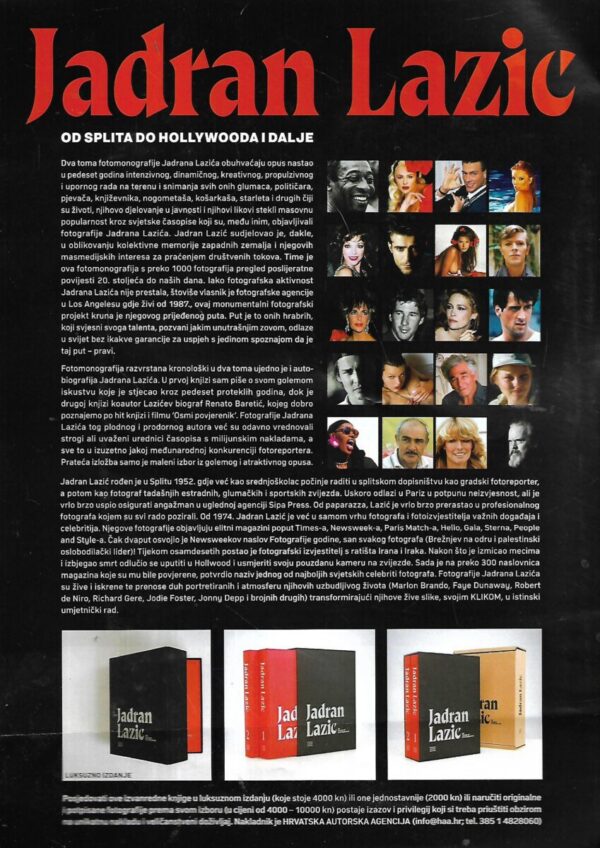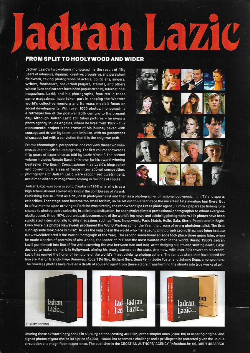 U ovoj raskošno opremljenoj monografiji su prikazani najzanimljiviji trenuci iz pedeset godina duge karijere našeg prvog paparazza Jadrana Lazića. Tiskana kao luksuzni set od dva visokokvalitetna sveska velikog formata i pakirana u prigodnoj kutiji (prvi svezak od 493 stranica i drugi od 413 stranica). Monografija je dostupna kao hrvatsko i englesko izdanje. Dva toma fotomonografije Jadrana Lazića obuhvaćaju opus nastao u pedeset godina intenzivnog, dinamičnog, kreativnog, propulzivnog i upornog rada na terenu i snimanja svih onih glumaca, političara, pjevača, književnika, nogometaša, košarkaša, starleta i drugih čiji su životi, njihovo djelovanje u javnosti i njihovi likovi stekli masovnu popularnost kroz svjetske časopise koji su, među inim, objavljivali fotografije Jadrana Lazića. Jadran Lazić sudjelovao je, dakle, u oblikovanju kolektivne memorije zapadnih zemalja i njegovih masmedijskih interesa za praćenjem društvenih tokova. Time je ova fotomonografija s preko 1000 fotografija pregled poslijeratne povijesti 20. stoljeća do naših dana. Iako fotografska aktivnost Jadrana Lazića nije prestala, štoviše vlasnik je fotografske agencije u Los Angelesu gdje živi od 1987., ovaj monumentalni fotografski projekt kruna je njegovog prijeđenog puta. Put je to onih hrabrih, koji svjesni svoga talenta, pozvani jakim unutrašnjim zovom, odlaze u svijet bez ikakve garancije za uspjeh s jedinom spoznajom da je taj put – pravi. Fotomonografija razvrstana kronološki u dva toma ujedno je i autobiografija Jadrana Lazića. U prvoj knjizi sam piše o svom golemom iskustvu koje je stjecao kroz pedeset proteklih godina, dok je drugoj knjizi koautor Lazićev biograf Renato Baretić, kojeg dobro poznajemo po hit knjizi i filmu ‘Osmi povjerenik’. Fotografije Jadrana Lazića tog plodnog i prodornog autora već su odavno vrednovali strogi ali uvaženi urednici časopisa s milijunskim nakladama, a sve to u izuzetno jakoj međunarodnoj konkurenciji fotoreportera. Prateća izložba samo je maleni izbor iz golemog i atraktivnog opusa. OD SPLITA DO HOLLYWOODA I DALJE Jadran Lazić rođen je u Splitu 1952. gdje već kao srednjoškolac počinje raditi u splitskom dopisništvu kao gradski fotoreporter, a potom kao fotograf tadašnjih estradnih, glumačkih i sportskih zvijezda. Uskoro odlazi u Pariz u potpunu neizvjesnost, ali je vrlo brzo uspio osigurati angažman u uglednoj agenciji Sipa Press. Od paparazza, Lazić je vrlo brzo prerastao u profesionalnog fotografa kojem su svi rado pozirali. Od 1974. Jadran Lazić je već u samom vrhu fotografa i fotoizvjestitelja važnih događaja i celebritija. Njegove fotografije objavljuju elitni magazini poput Times-a, Newsweek-a, Paris Match-a, Hello, Gala, Sterna, People and Style-a. Čak dvaput osvojio je Newsweekov naslov Fotografije godine, san svakog fotografa (Brežnjev na odru i palestinski oslobodilački lider)! Tijekom osamdesetih postao je fotografski izvjestitelj s ratišta Irana i Iraka. Nakon što je izmicao mecima i izbjegao smrt odlučio se uputiti u Hollwood i usmjeriti svoju pouzdanu kameru na zvijezde. Sada je na preko 300 naslovnica magazina koje su mu bile povjerene, potvrdio naziv jednog od najboljih svjetskih celebriti fotografa. Fotografije Jadrana Lazića su žive i iskrene te prenose duh portretiranih i atmosferu njihovih uzbudljivog života (Marlon Brando, Faye Dunaway, Robert de Niro, Richard Gere, Jodie Foster, Jonny Depp i brojnih drugih) transformirajući njihove žive slike, svojim KLIKOM, u istinski umjetnički rad.