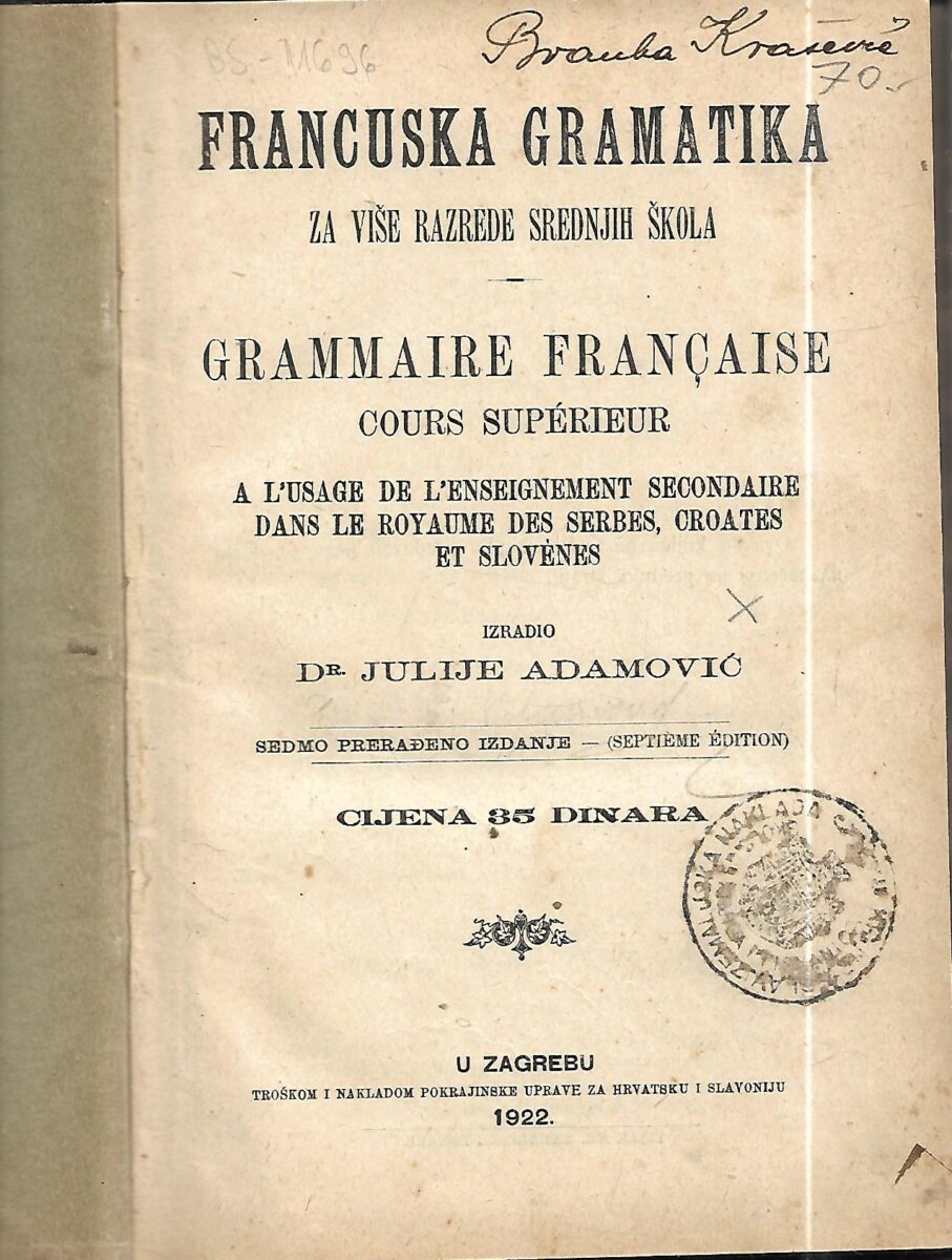 Julije Adamović: Francuska gramatika za više razrede srednjih škola