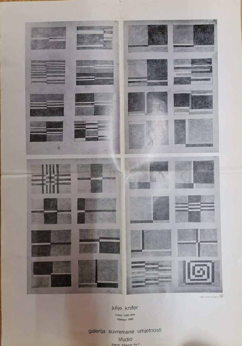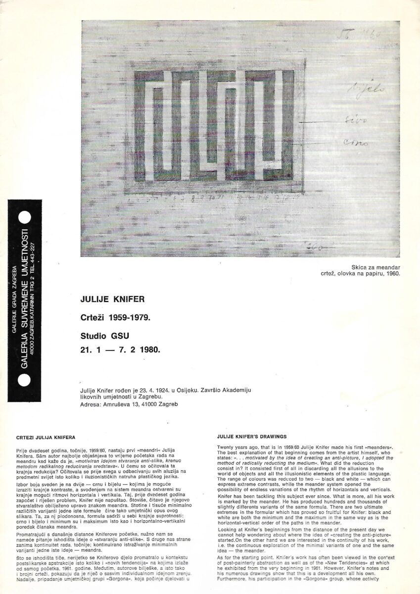 1959/1960 nastaju prvi “meandri” Julija Knifera. Sam autor najbolje objašnjava to vrijeme početka rada na meandru kad kaže da je “motiviran idejom stvaranja anti-slike, krenuo metodom radikalnog reduciranja sredstava”. U čemu se očitovala ta krajnja redukcija? Očitovala se prije svega u odbacivanju svih alizija na predmetni svijet isto koliko i iluzonističkih natruha plastičkog jezika.