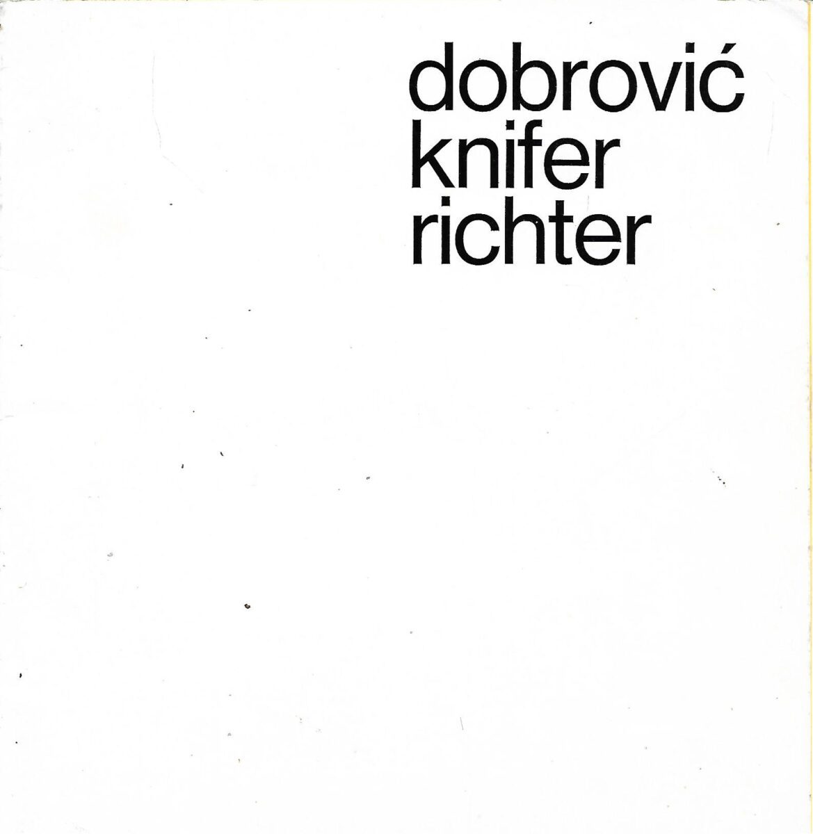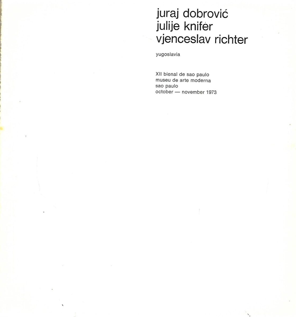 Lijepi, bogato ilistrirani katalog Juraj Dobrović, Julije Knifer i Vjenceslav Richter – XII bienal de Sao Paolo, octobar – november 1973. Introduction Radoslav Putar. Fotografije Mitja Koman. Printed in GZH. Editor Božo Bek. Layout Željko Škeljo.