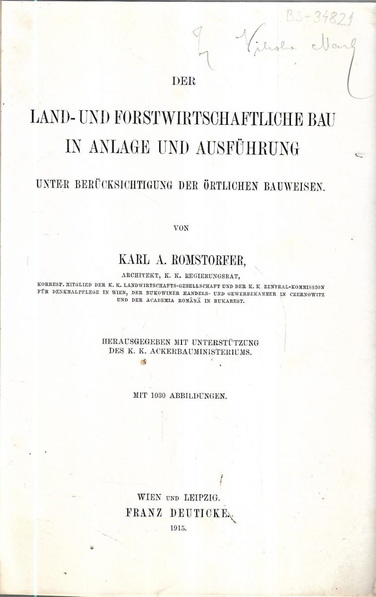 “Der Land und forstwirtschaftliche Bau in Anlage und Ausfuhrung unter berucksichtigung der ortlichen bauweisen von Karl A. Romstorfer”