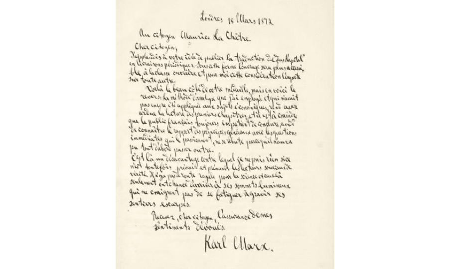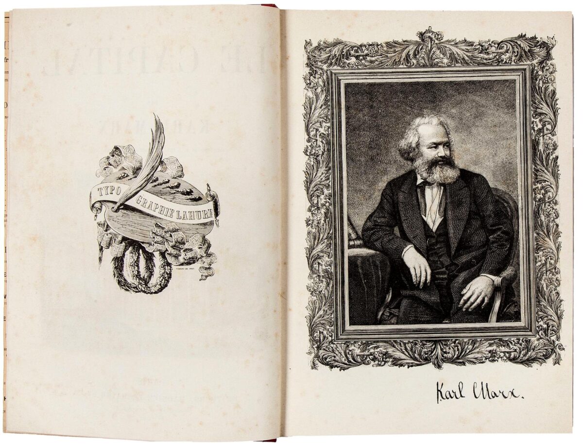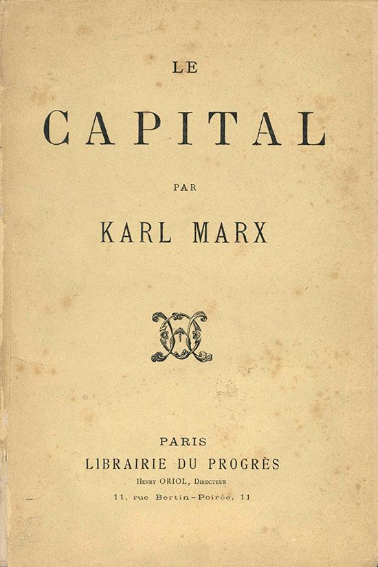 Pariz: Uredništvo: Maurice Lachatre, [1872-5]. Dimenzije: 281 x 192 mm. U dobrom stanju. Ugraviran Marxov portret na početnim stranicama te Marxovo pismo izdavaču uz popratni potpis datiran 18. ožujka 1872. Prvo izdanje na francuskom autorizirano i nadgledano od strane samog Karla Marxa. Knjiga je objavljivana u djelovima od kolovoza 1872. do studenog 1875. te je tu objedinjena. Prvo izdanje je originalno izdano na njemačkom 1867; a ova verzija je tek drugi prijevod nakon ruskog 1872; no Marx je smatrao da je mnogo važnija verzija od one na ruskom i njegov temeljiti rad na ovom izdanju je značio da ovo nije puki prijevod već zasebno djelo relevantno s tekstualne točke gledišta.