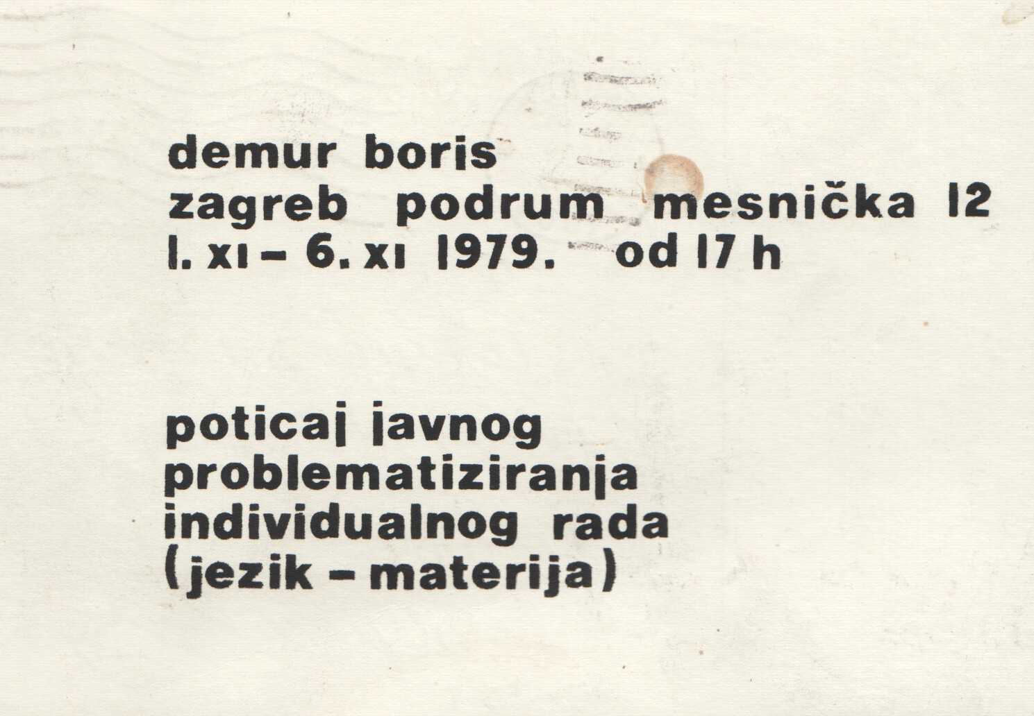 Kartolina – Boris Demur, Zagreb Podrum Mesnika. 1.11.-06.11.1979. Poticanje javnog problematiziranja individualnog rada (jezik-materija)