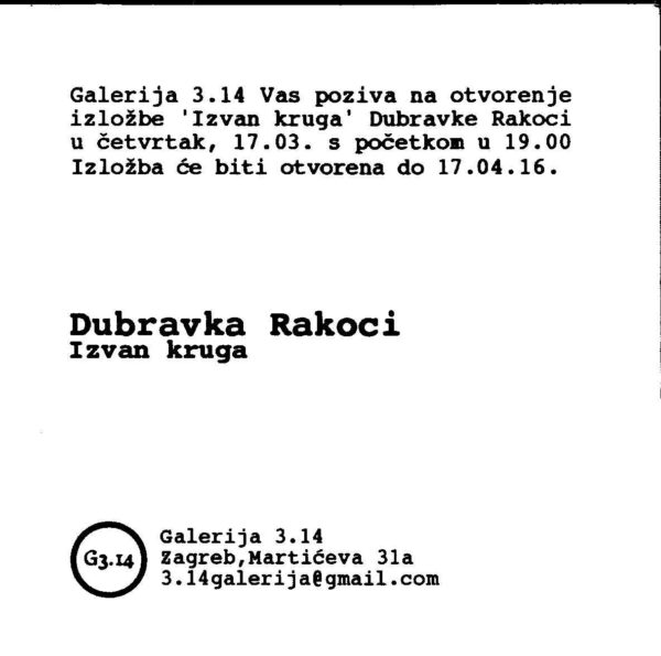 Kartolina – Dubravka Rakoci, pozivnica galerija 3.14 Izvan kruga 17.03.-17.04.2016.