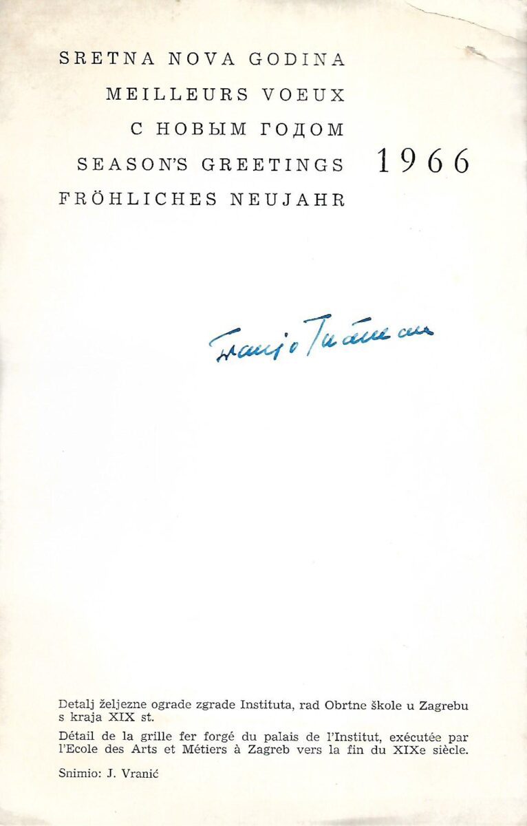 Čestitka upućena filozofu Danku Grliću za novu godinu 1966. od tadašnjeg ravnatelja Franje Tuđmana, s potpisom.