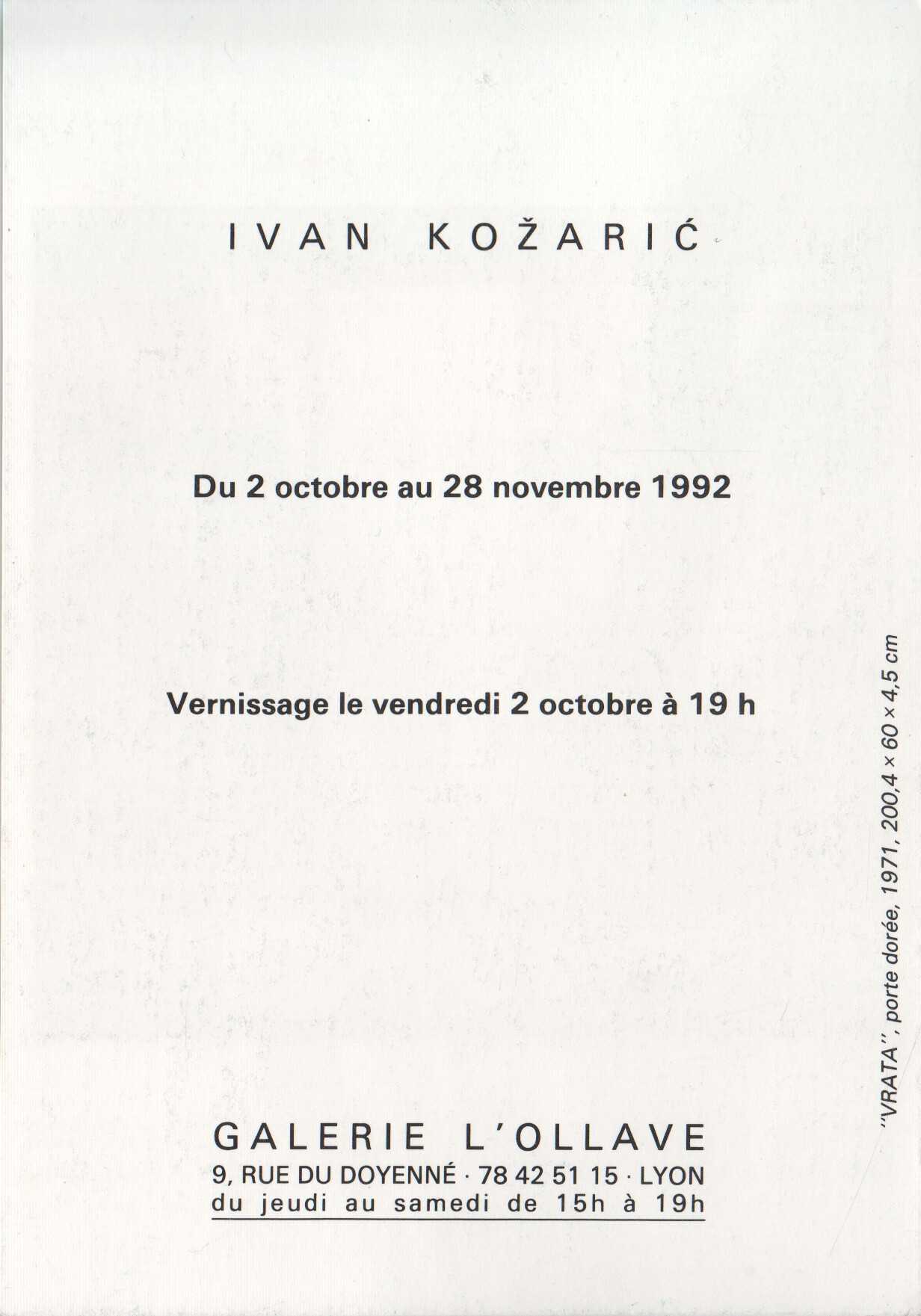 Kartolina – Ivan Kožarić, Vrata, porte doree 1971. Galerie L`ollave – 02.10.-28.11.1992.