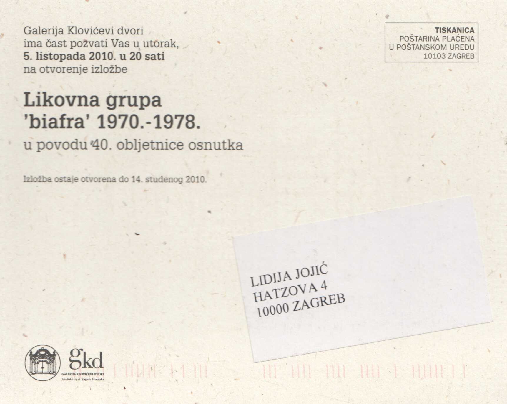 Kartolina – Likovna grupa “biafra” 1970.-1978. Povodom 40. obljetnice osnutka. 05.10.2010.-14.11.2010. u Galeriji Klovićevi dvori
