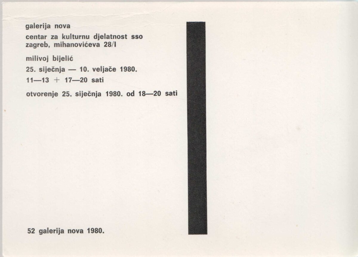 Kartolina – Miliboj Bijelić. Galerija nova, centar za kulturnu djelatnost sso, Zagreb 25.01.-10.02.1980. 52.Galerija nova 1980.