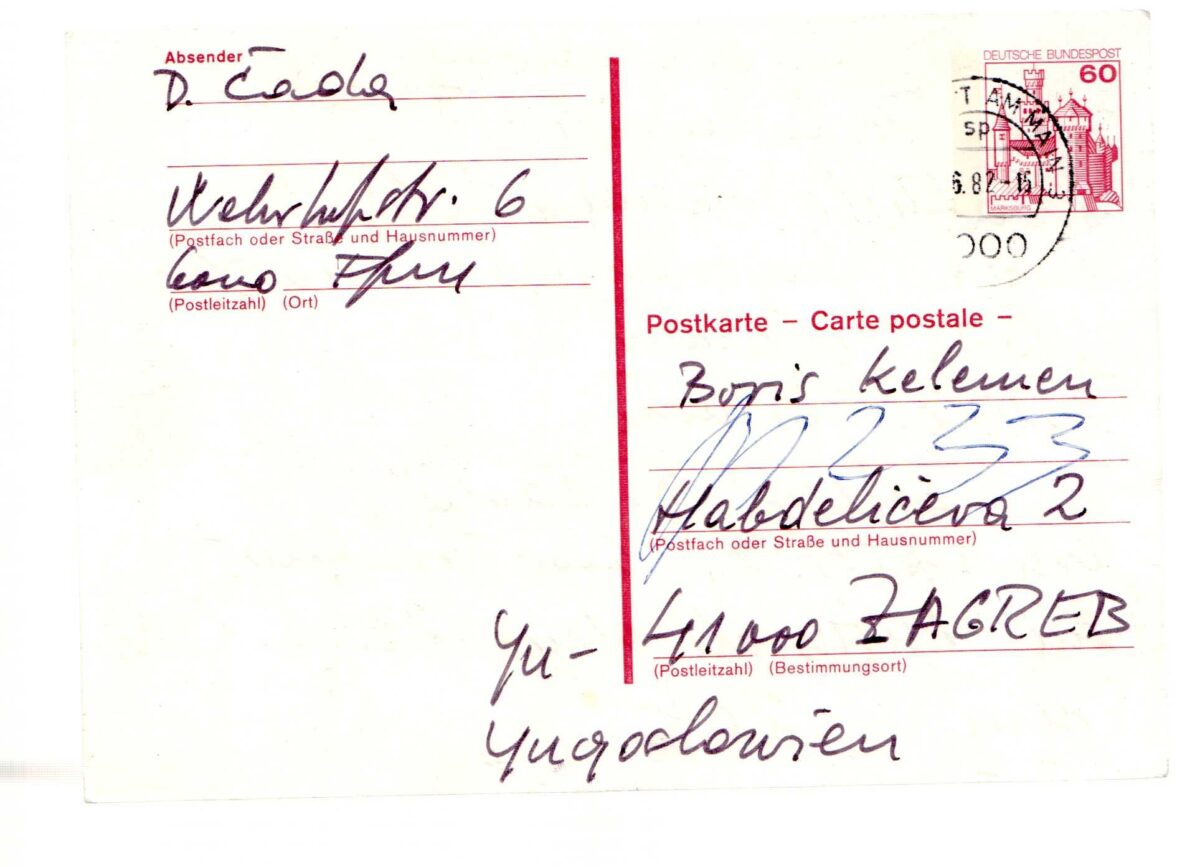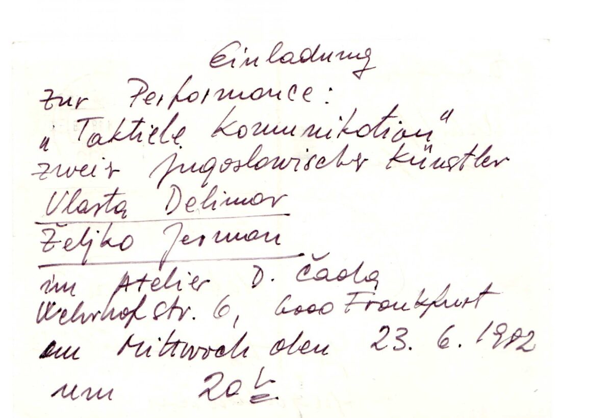 Kartolina – Eiuladung, performans Vlasta Delimar i Željko Jeman. 23.06.1982. u galeriji D. Čada.