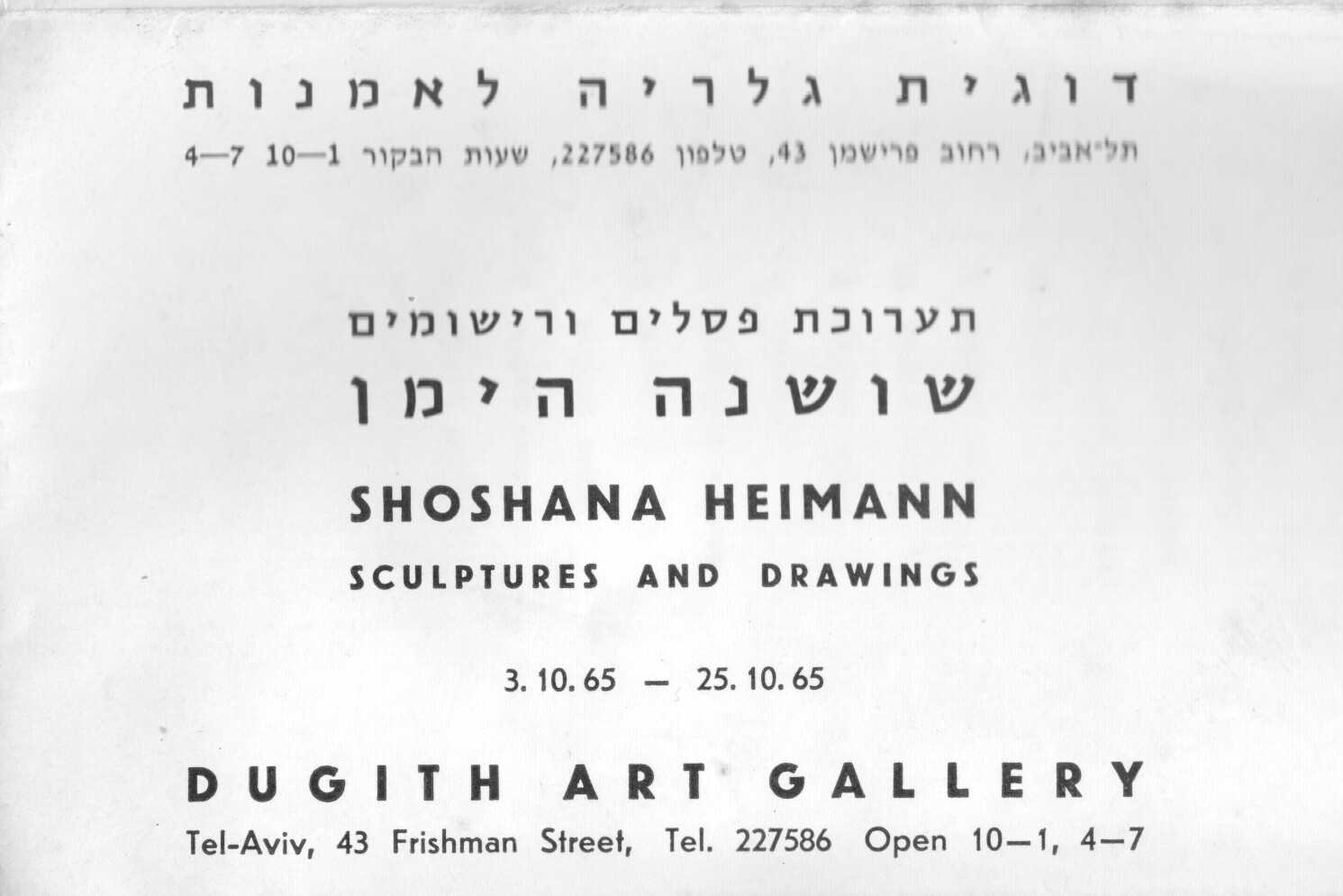 Kartolina – Shoshana Heimann. Shoshana Heimann- Sculptures and drawings. 03.10.1965.-25.10.1965. Dugith art Gallery.