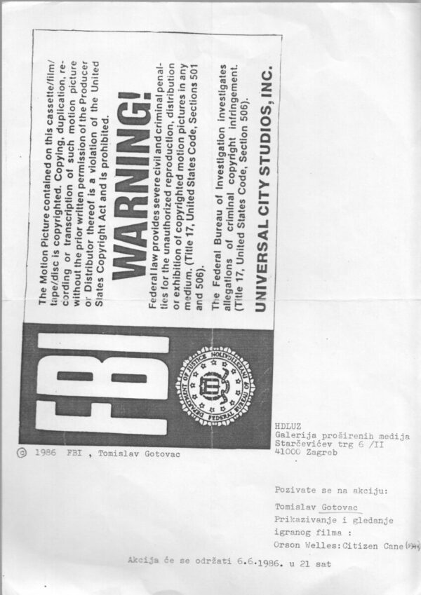 Kartolina – Tomislav Gotovac, akcija Prikazivanje i gledanje igranog filma: Orson Welles: Citizen Cene (1941.) . 06.06.1986.