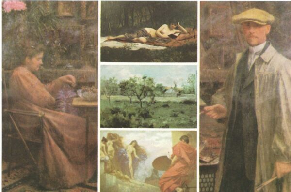 Kartolina – Vlaho Bukovac (1855-1922).Portret supruge (1915), Autoportret u ateljeu (1915), Ženski akt (1880), Pejsaž s Montmartrea II (1887), Alegorija slika (1897). Umjetnička galerija, Dubrovnik i Galerija Bukovac, cavtat