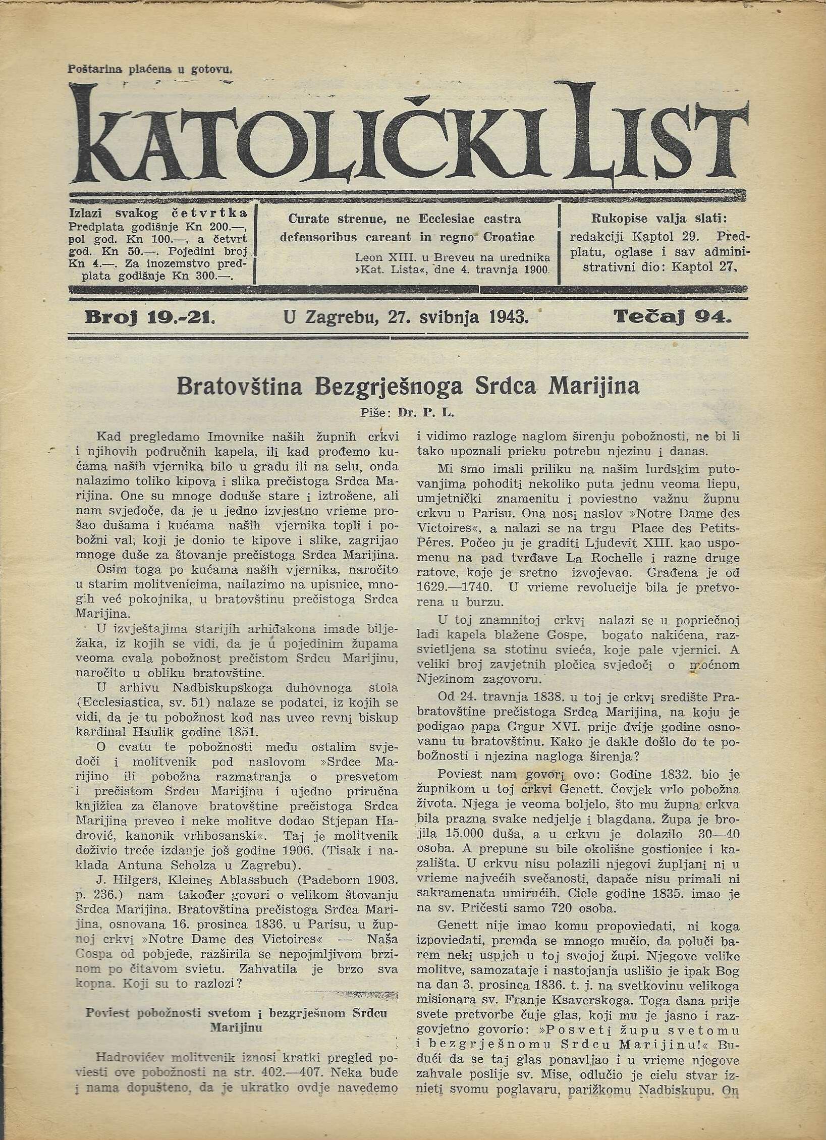 | Izdavač i godina: | Nadbiskupija zagrebačka, 1943. |