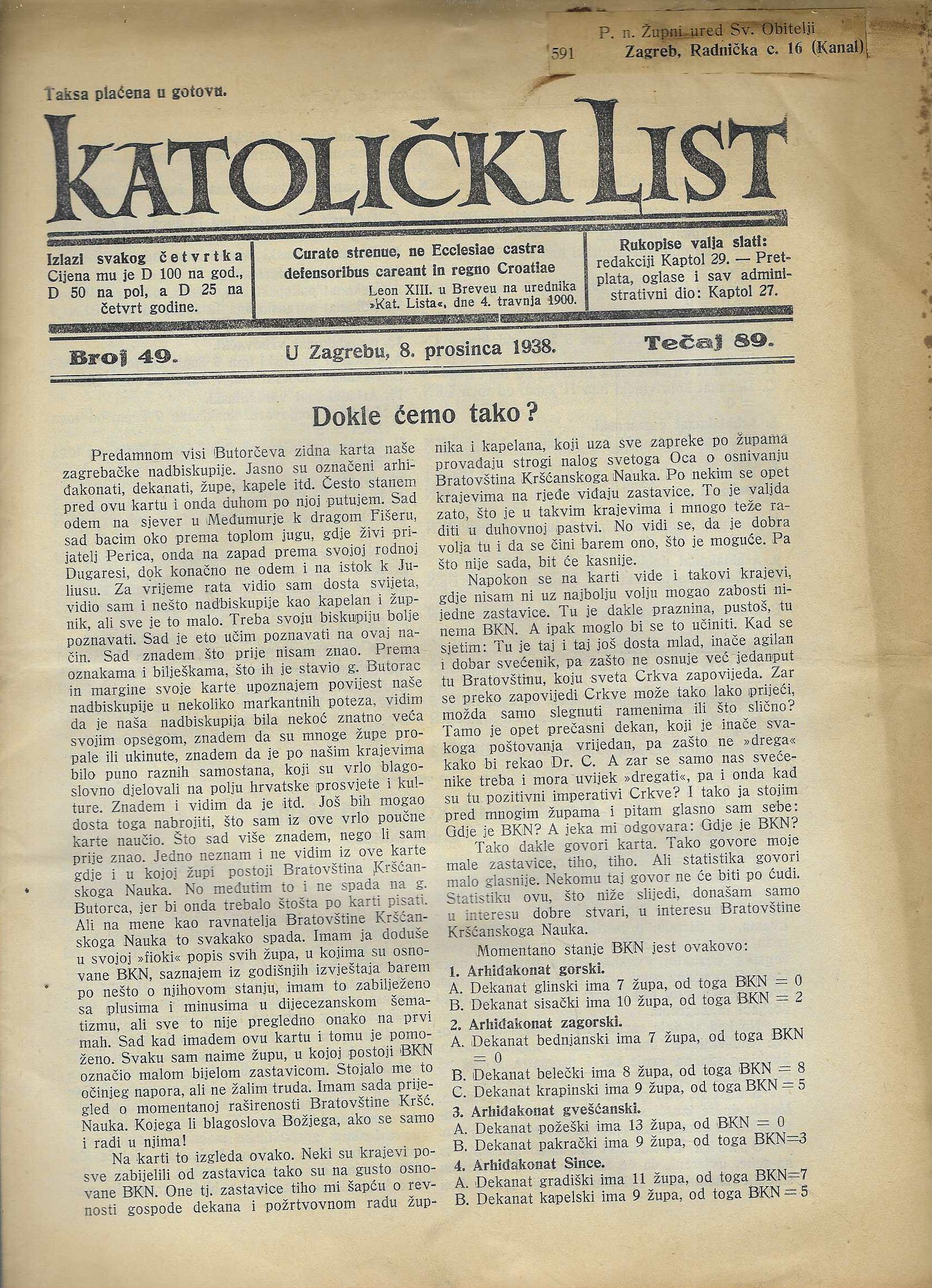 Katolički list, broj 49., 8. prosinca 1938.
