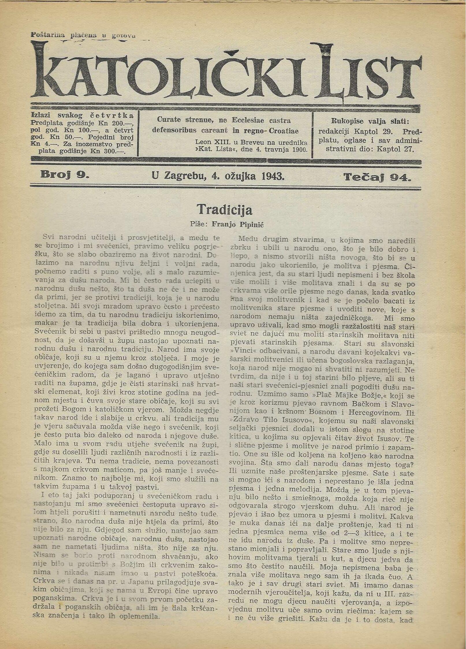 | Izdavač i godina: | Nadbiskupija zagrebačka, 1943. |