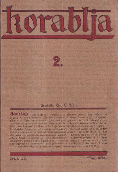 Korablja 2, 1929. Drugi broj književnog časopisa Korablja iz 1929. Časopis je pokrenuo književnik Ćiro Č. Šajin. Rijetko. Stanje: izvrsno.