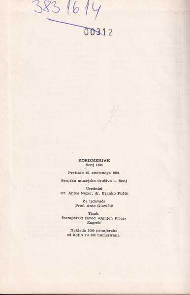Izdavač i godina: Senjsko muzejsko društvo, 1981.