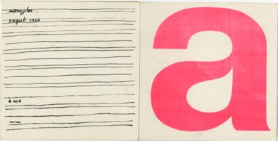 Jedan list (veličine 16×47,8 Cm rasklopljen) presavijen dva puta. Tiskano u sitotisku. Dimitrije Bašićević Mangelos (1921.-1987.), Član avangardne skupine Gorgona i sudjelovao u pokretu Nove tendencije. Ivan Picelj (Okučani, 1924. – Zagreb 2011.) svjetski poznati umjetnik i grafički dizajner, jedan od osnivača grupe Exat 51 i Nove tendencije, izlagao je u brojnim europskim zemljama (često u galeriji Denise Rene, Pariz) i u SAD. 1962. lansirao je izdanje ” a ” i sam ga objavio. Do 1964. objavljeno je ukupno sedam brojeva.