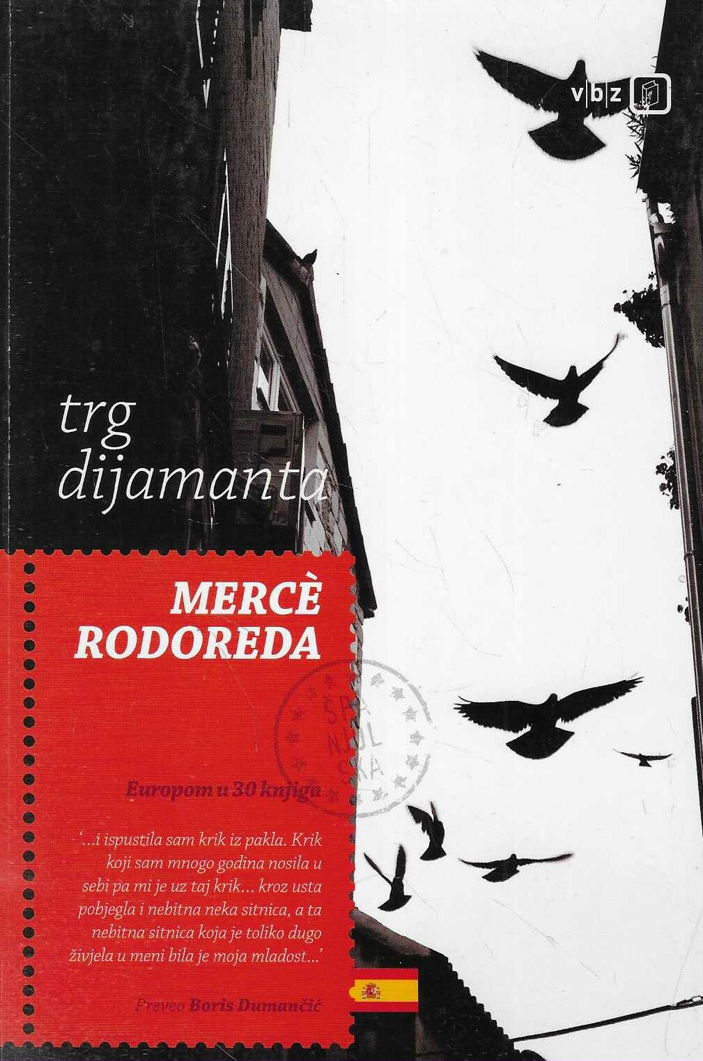“Glas pripovjedačice, Natàlije, jedinstven je u svjetskoj književnosti: nakon nekoliko rečenica prisvojite je kao sestru, prijateljicu, rođakinju, dragu susjedu… Neposredno i živopisno odmah vas uvodi u svijet Barcelone 1930-ih i Druge Španjolske Republike. Pisan u prvom licu, na prvu neobičnim ali autentičnim, naizgled naivnim jezikom, roman je na tragu toka svijesti, ali očišćen od suvišnog. Čitatelj saznaje samo ono što se događa junakinji i u njoj, samo iz njezine perspektive. Natàlia, djevojka skromna porijekla, na fešti na Trgu dijamanta, susreće nepoznata mladića koji je, usprkos početnoj odbojnosti, šarmira. Natalia i Quimet se ubrzo ožene, sirotinjski se kuće, uživaju u malim radostima, ubrzo imaju dvoje djece… Quimetu se uzgoj golubova pretvori u opsesiju zbog koje trpi cijela obitelj. Natàlia je očajna, ali dobra prijateljica, senyora Enriqueta, uvijek joj kaže: ‘Draga moja, sve ti je to život.’ Mercè Rodoreda najznačajnija je katalonska novelistica 20. stoljeća, a roman Trg dijamanta remek je djelo europske književnosti – preveden je na više od trideset jezika. Rodoreda je pisala na katalonskom, a od 1939. živjela je u egzilu.” – Jadranka Pintarić