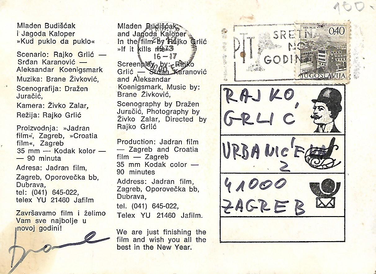 Razglednica – čestitka upućena Rajku Grliću povodom nove godine 1973.