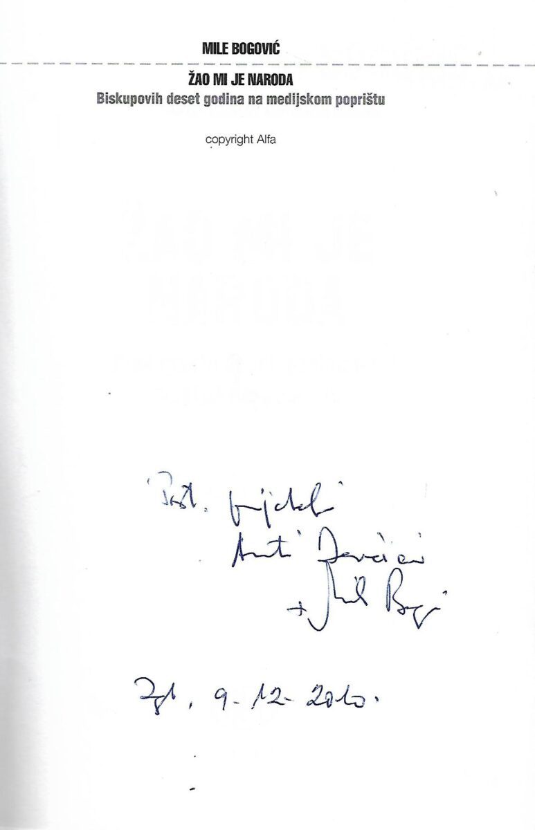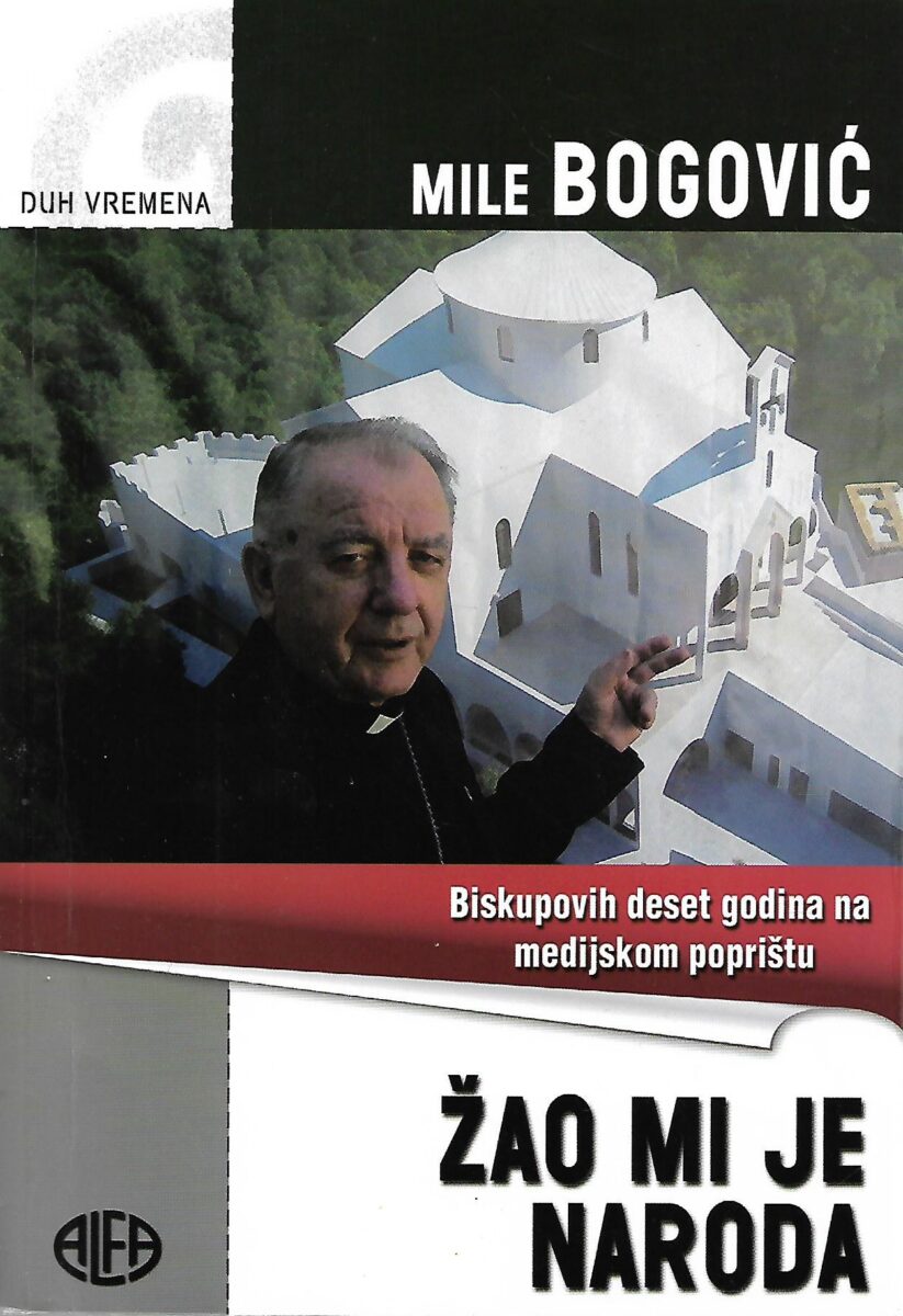 Knjiga pod nazivom «Žao mi je naroda» sastoji se od četiri cjeline. U 1. dijelu pod nazivom «Deset godina poslije» razgovor je urednika Bežena s biskupom obavljen srpnja ove godine a koji predstavlja sažeti retrospektivni uvida u temeljne stavove iznašane zadnjih deset godina javnog nastupanja u medijima. U 2. cjelini «Svjedočenja o našem vremenu» biskup prosuđuje društvene događaje na nacionalnoj sceni koji sadrže moralne kontroverze, dileme i osporavanja. Treće je poglavlje pod nazivom «Osnivanje i rast Gospićko-senjske biskupije» koji sadrže tekstove biskupa Bogovića o povijesnim korijenima i aktualnim razlozima ponovne uspostave biskupije s druge strane Velebita. Posljednje poglavlje sadrži tekstove u gradnji Crkve hrvatskih mučenika na Udbini. U knjizi se na kraju nalazi popis tiskanih i elektroničkih medija u kojima su obavljeni razgovori s biskupom Bogovićem kao i popis novinara s kojima je za medije razgovarao biskup Bogović. Na kraju se nalazi i popis osoba, mjesta i pojmova.