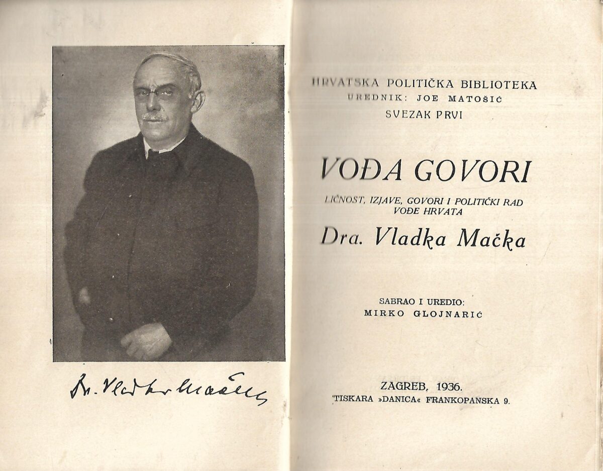 Mirko Glojnarić(ur.): Vođa govori. Ličnost, izjave, govori i politički rad vođe Hrvata Dra. Vladka Mačeka.